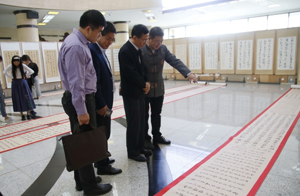 為熱烈慶祝新中國成立70周年,9月24日上午,由校工會、人文學(xué)院聯(lián)合主辦的“詩詞鑒初心,筆墨寫華章”盧強(qiáng)創(chuàng)作毛澤東詩詞百米書法長卷展暨盧強(qiáng)毛澤東詩詞書法作品展,在我校鄠邑校區(qū)圖書館開幕。校黨委副書記張木出席開幕式。校工會、人文學(xué)院、鄠邑校區(qū)管理辦公室、教務(wù)處、學(xué)生處、圖書館負(fù)責(zé)人及數(shù)百名師生參加了開幕式。