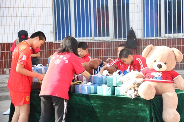 大愛無言,真愛無疆。小朋友們對(duì)師生們的到來舉行了熱烈的歡迎儀式,東周兒童村村民委員會(huì)主任楊彪也對(duì)大家的到來表示了最熱烈的歡迎和衷心的感謝,并充分肯定了本次活動(dòng)的意義。他表示,這二十多年來,孩子們?cè)诤痛蟾绺绱蠼憬銈兿嗵幹?,都逐漸走出了生活的陰影,大都長(zhǎng)高了,長(zhǎng)胖了,臉上也露出了童年的天真和歡笑。同時(shí),機(jī)械工程學(xué)院黨委書記田黨宏也對(duì)小朋友們進(jìn)行了勉勵(lì)和鼓舞,并表示機(jī)械工程學(xué)院的全體師生會(huì)一直將愛心持續(xù)下去。學(xué)生工作部部長(zhǎng)趙健和人文學(xué)院黨委書記余小勇代表此行的志愿者把屬于孩子們的心愿禮物親自送到他們的手中。由音樂系和少數(shù)民族的同學(xué)們?yōu)榇蠹規(guī)砹斯艠泛献唷毒艃骸贰洞航ㄔ乱埂贰犊鞓返柠溛鱽砥铡贰锻米游琛返染始姵实墓?jié)目,全體師生與孩子們一起互動(dòng),共同聯(lián)歡,一同沉浸在這愛的海洋里。