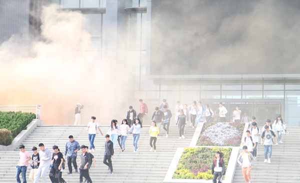 講座結(jié)束后,保衛(wèi)處聯(lián)合學生處、圖書館,在化學化工學院、電子工程學院、機械工程學院、計算機學院、經(jīng)濟管理學院的支持下,組織500余名學生在鄠邑校區(qū)圖書館進行了防火避震應(yīng)急疏散逃生演練。為了模擬火災現(xiàn)場的煙霧場景,在圖書館南門兩側(cè)燃放了消防演習煙霧彈,隨著警報信號的發(fā)出,同學們有序地離開圖書館,500余名師生在5分鐘內(nèi)安全撤離到達指定地點。