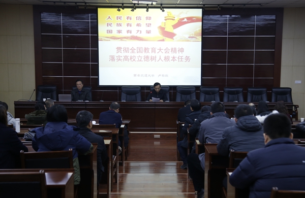 盧黎歌教授以《貫徹全國(guó)教育大會(huì)精神 落實(shí)高校立德樹人根本任務(wù)》為題,從“充分理解全國(guó)教育大會(huì)的歷史意義”、“認(rèn)真領(lǐng)會(huì)全國(guó)教育大會(huì)精神”、“結(jié)合我省實(shí)際重在貫徹落實(shí)”三個(gè)方面對(duì)全國(guó)教育大會(huì)精神進(jìn)行了全面宣講和精細(xì)解讀。