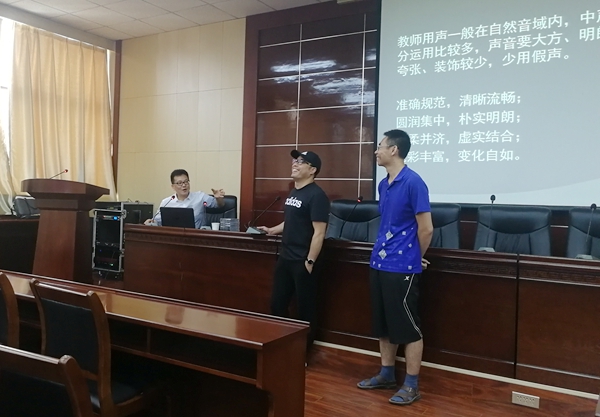 吟誦藝術國家級骨干教師、陜西師范大學何明家老師作了題為《教師教學發(fā)音技巧和嗓音保健》的講座。他從人體發(fā)聲器官解剖圖入手,深入淺出地剖析了發(fā)聲原理和影響人聲音質的要素。他談到,教師的職業(yè)要求決定了正確發(fā)聲的必要性,一定要重視嗓音保健。他現(xiàn)場為發(fā)言的老師評估音質,分析發(fā)音存在的問題,結合現(xiàn)場案例,幫助青年教師正確理解發(fā)聲機理和運用嗓音的技巧,并耐心傳授穩(wěn)定、協(xié)調、平衡發(fā)聲的技巧。