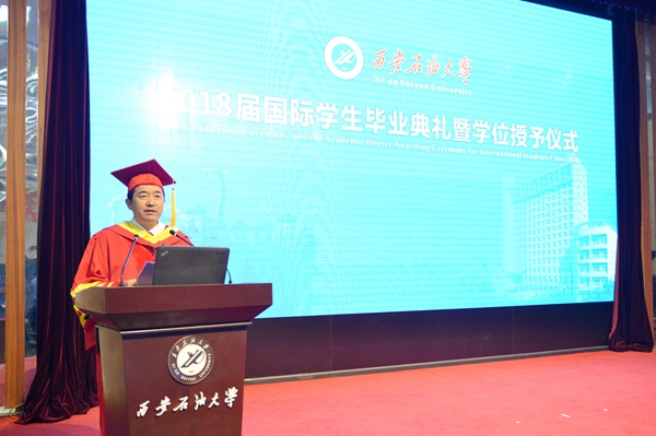 6月27日下午,我校2018屆國際學(xué)生畢業(yè)典禮暨學(xué)位授予儀式在雁塔校區(qū)學(xué)術(shù)報告廳舉行。校長李天太,特邀嘉賓、原校長屈展出席。副校長陳軍斌主持。哈薩克斯坦國際一體化基金會西安代表處負(fù)責(zé)人,我校相關(guān)部門、學(xué)院負(fù)責(zé)人,國際學(xué)生導(dǎo)師代表、國際學(xué)生教學(xué)與管理人員,全體畢業(yè)國際學(xué)生、家長代表、在校學(xué)歷留學(xué)生參加了儀式。
