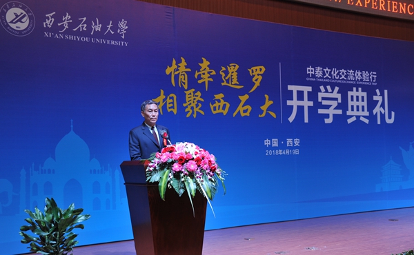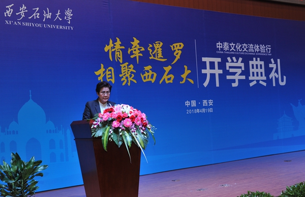 4月19日上午,我校在鄠邑校區(qū)弘石報告廳隆重舉行“情牽暹羅?相聚西石大——中泰文化交流體驗行”項目開學(xué)典禮。泰國薩拉武力府教育廳廳長維拉彭·德才、泰國教育部第二教育區(qū)主任拉蒂瑪·帕尼查弩芭、泰國教育部特殊教育局局長蘇達·素嫵,陜西省教育廳副廳長趙昶葆、我校校長屈展出席開學(xué)典禮。泰國中學(xué)校長代表團一行17人、參加體驗行活動的172名泰國師生以及我校百余名人文學(xué)院師生參加了系列活動。副校長陳軍斌主持儀式。