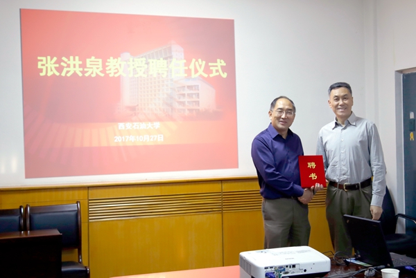 10月27日上午,我校在行政樓二樓會議室舉行了張洪泉客座教授聘任儀式。屈展校長出席儀式,李天太副校長主持儀式,人事處、科技處、石油工程學院負責人參加了儀式。