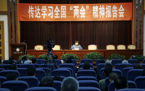 3月17日下午,校黨委中心組理論學(xué)習(xí)擴(kuò)大會(huì)學(xué)習(xí)十二屆全國(guó)人大五次會(huì)議和全國(guó)政協(xié)十二屆五次會(huì)議精神。校領(lǐng)導(dǎo)和100余名處級(jí)干部參加了學(xué)習(xí)。全國(guó)人大代表、中科院院士、中科院地球環(huán)境研究所所長(zhǎng)、陜西省政協(xié)副主席周衛(wèi)健和全國(guó)政協(xié)委員、陜西東科制藥有限責(zé)任公司副董事長(zhǎng)趙東科教授為大家傳達(dá)了全國(guó)“兩會(huì)”精神。