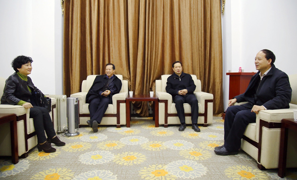 賽云秀書(shū)記與省委組織部副部長(zhǎng)王秉琦(右二)、省委干部教育辦公室副主任郭文超(左二)、省委高教工委副書(shū)記陳乃霞(左一)交流