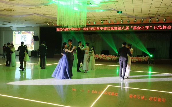 舞會(huì)現(xiàn)場(chǎng)燈光搖曳,氣氛浪漫,團(tuán)學(xué)干部伴著一支支舞曲輕盈起舞?!昂诮鹬埂眻F(tuán)學(xué)干部交流會(huì)是校團(tuán)委、校學(xué)生會(huì)為鼓勵(lì)各級(jí)團(tuán)學(xué)干部在過(guò)去一年中為學(xué)校校園文化、實(shí)踐育人、學(xué)風(fēng)建設(shè)等各項(xiàng)工作中做出的貢獻(xiàn),特地舉辦的一個(gè)便于團(tuán)學(xué)干部相互溝通、相互交流的活動(dòng),有助于提高我校團(tuán)學(xué)干部的綜合素質(zhì)及營(yíng)造良好的校園氛圍。