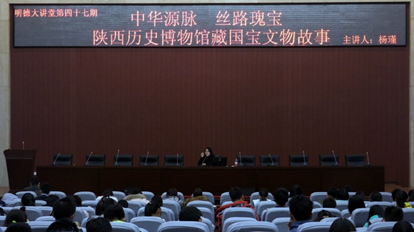 12月14日晚,由合作發(fā)展處、校團(tuán)委共同主辦的第47期明德大講堂之《中華源脈 絲路瑰寶——陜西歷史博物館藏國寶文物故事》在新校區(qū)圖書館弘石學(xué)術(shù)報(bào)告廳舉辦。陜西歷史博物館科研管理處處長、中共陜西省委宣傳部理論講師團(tuán)特聘專家楊瑾老師擔(dān)任主講,新校區(qū)近四百余名學(xué)生聽取了講座。