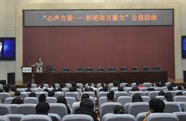11月17日晚,由陜西廣播電視臺896汽車調(diào)頻《長安夜話》節(jié)目發(fā)起,團省委青少年權(quán)益維護中心、陜西省律師協(xié)會共同支持的“心聲力量——拒絕語言暴力”公益活動在我校新校區(qū)舉辦。知名主播曉輝、馬小路、馬大帥擔任主講嘉賓,此次活動由校團委承辦。