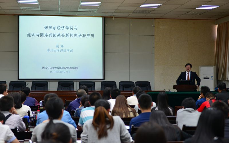 隨后,姚峰教授在第三會議室為我校師生作了題為《諾貝爾經(jīng)濟(jì)學(xué)獎與經(jīng)濟(jì)時間序列因果分析的理論和應(yīng)用》的學(xué)術(shù)報告。