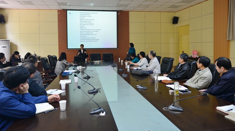 4月11日上午,美國加州大學(xué)原校長助理Ellen Switkes博士、加州大學(xué)伯克利分校高等教育研究所中心工作人員滕霞博士應(yīng)邀來我校作高等教育學(xué)術(shù)報告。報告會在校本部第一會議室舉行。校黨政領(lǐng)導(dǎo)屈展、張木、李天太、陳軍斌出席。各相關(guān)部門、各院(部、系)負(fù)責(zé)人及部分留學(xué)生參加了報告會。