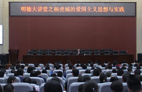 4月7日下午,由校團(tuán)委主辦、化學(xué)化工學(xué)院團(tuán)委承辦的第41期明德大講堂之《楊虎城的愛國主義思想與實踐》在新校區(qū)圖書館弘石報告廳舉辦。愛國將領(lǐng)楊虎城將軍之孫——楊瀚先生擔(dān)任主講,新校區(qū)四百余名師生參加了講座。