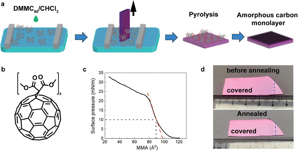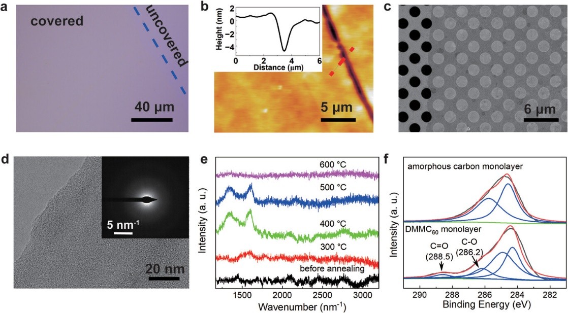 本研究中以改性的富勒烯單體為前驅(qū)體,通過(guò)Langmuir-Blodgett制膜-快速熱解兩步法制備了厘米尺寸的單層多孔非晶碳膜。研究證明其為亞穩(wěn)態(tài)結(jié)構(gòu)且不導(dǎo)電。此外,離子跨膜傳輸研究表明該膜具有陽(yáng)離子選擇性(選擇性為26%)。這項(xiàng)工作對(duì)單層多孔非晶碳膜的可控制備具有指導(dǎo)意義。