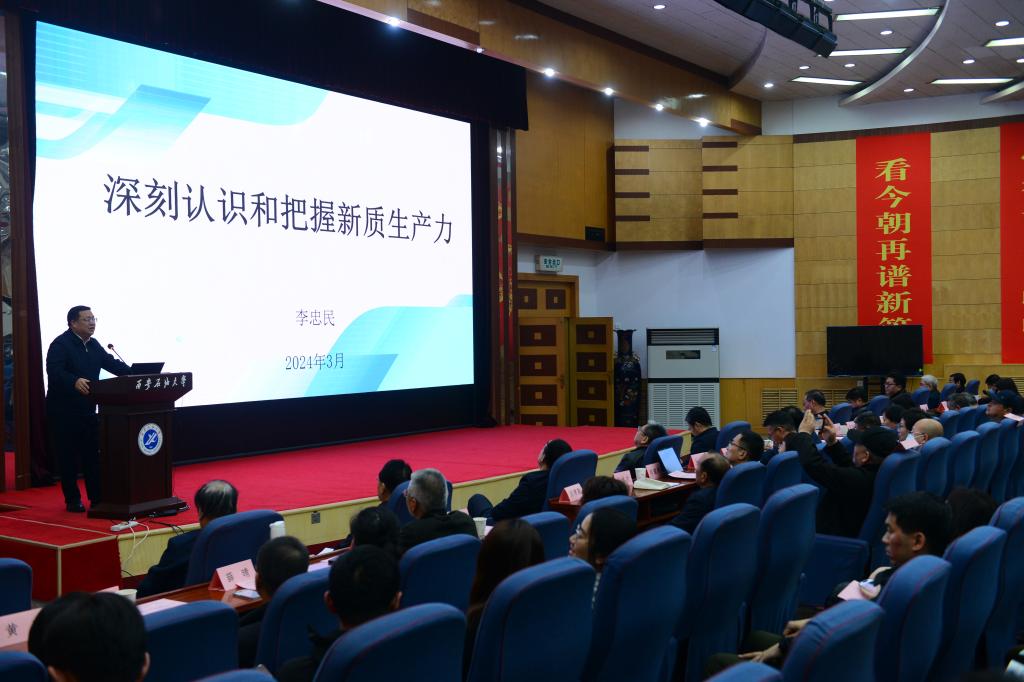 李忠民領(lǐng)學(xué)了習(xí)近平總書記在全國兩會期間的重要講話精神,就如何深刻把握因地制宜發(fā)展新質(zhì)生產(chǎn)力,從馬克思主義生產(chǎn)力理論、世界生產(chǎn)力發(fā)展概況、深刻認(rèn)識把握新質(zhì)生產(chǎn)力、因地制宜發(fā)展新質(zhì)生產(chǎn)力四個方面作了專題報告。李忠民表示,新質(zhì)生產(chǎn)力特點(diǎn)是創(chuàng)新,關(guān)鍵在質(zhì)優(yōu),本質(zhì)是先進(jìn)生產(chǎn)力。發(fā)展新質(zhì)生產(chǎn)力就是要積極培育新能源、新材料、先進(jìn)制造、電子信息等戰(zhàn)略性新興產(chǎn)業(yè),積極培育未來產(chǎn)業(yè),因地制宜加快發(fā)展新質(zhì)生產(chǎn)力,增強(qiáng)發(fā)展新動能。要深入學(xué)習(xí)領(lǐng)會習(xí)近平總書記重要講話和全國兩會精神,深刻把握當(dāng)前國際國內(nèi)形勢,深刻領(lǐng)會因地制宜發(fā)展新質(zhì)生產(chǎn)力、全面深化改革開放、促進(jìn)區(qū)域協(xié)調(diào)發(fā)展、加強(qiáng)生態(tài)文明建設(shè)、形成推動發(fā)展強(qiáng)大合力的重要內(nèi)涵,在奮力譜寫陜西新篇、爭做西部示范中展現(xiàn)新作為。