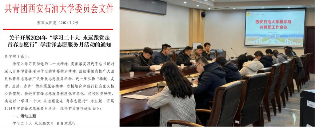 一是印發(fā)《關(guān)于開展2024年“學(xué)習(xí)二十大 永遠跟黨走 青春志愿行”學(xué)雷鋒志愿服務(wù)月活動的通知》,積極組織全校各級團組織圍繞關(guān)愛留守兒童、鄉(xiāng)村振興、助殘助老、生態(tài)環(huán)保等方面,集中開展為期一個月的“學(xué)雷鋒”志愿服務(wù)活動。二是召開學(xué)校共青團、學(xué)生會工作會議,及時組織各院系團委書記、學(xué)生會執(zhí)行主席,集中學(xué)習(xí)習(xí)近平總書記關(guān)于志愿服務(wù)重要指示精神,進一步加深對志愿服務(wù)工作的認識和理解。三是于3月5日學(xué)雷鋒紀念日當天,組織我校300余名師生代表,在鄠邑校區(qū)東方廣場隆重舉行2024年“學(xué)雷鋒”志愿服務(wù)月啟動儀式。