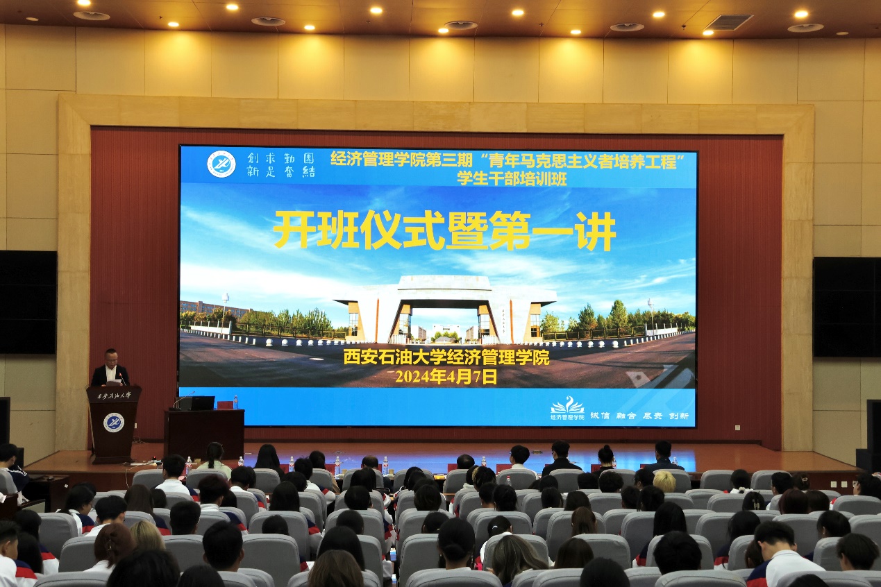 為深入學(xué)習(xí)貫徹習(xí)近平新時(shí)代中國特色社會主義思想和黨的二十大精神,提高青年學(xué)生的馬克思主義理論素養(yǎng)和實(shí)踐能力,引領(lǐng)廣大青年做有理想、敢擔(dān)當(dāng)、能吃苦、肯奮斗的新時(shí)代好青年,4月7日晚,經(jīng)濟(jì)管理學(xué)院第三期“青年馬克思主義者培養(yǎng)工程”學(xué)生干部培訓(xùn)班開班儀式暨第一講在鄠邑校區(qū)弘石學(xué)術(shù)報(bào)告廳順利舉辦。校黨委副書記張木出席開班儀式并作專題輔導(dǎo)報(bào)告。經(jīng)濟(jì)管理學(xué)院黨委書記談建勤,全體學(xué)生工作干部以及學(xué)生干部400余人參加培訓(xùn)班開班儀式暨第一講。開班儀式由經(jīng)濟(jì)管理學(xué)院黨委副書記王剛主持。