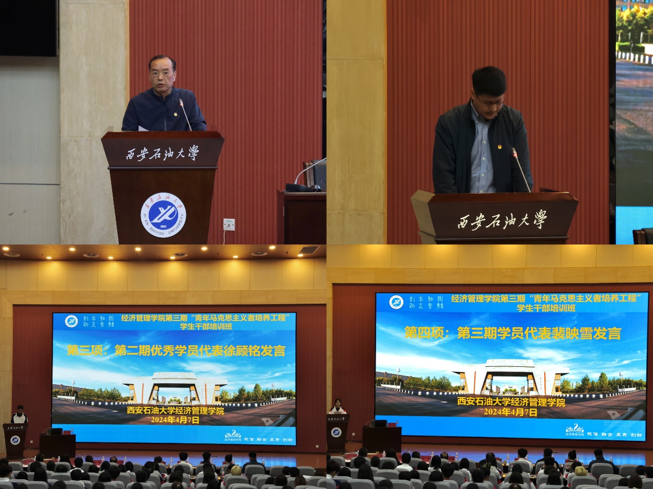 談建勤在總結(jié)時(shí)指出,廣大青年學(xué)生干部應(yīng)當(dāng)發(fā)揮先鋒作用,踐行鐵人精神,汲取前進(jìn)力量,努力做黨的事業(yè)的忠誠擁護(hù)者和堅(jiān)定實(shí)踐者。他希望與會學(xué)生干部要仰望星空、腳踏實(shí)地,向善向上、陽光自信,勇立潮頭、勇爭第一。學(xué)院團(tuán)委書記李博文宣讀了本期培訓(xùn)班的培訓(xùn)通知及考核要求,學(xué)院第二期培訓(xùn)班優(yōu)秀學(xué)員代表徐顧銘與第三期培訓(xùn)班學(xué)員代表裴映雪分別發(fā)言。