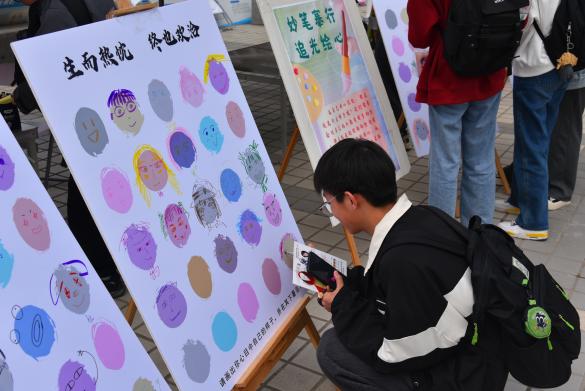 校醫(yī)院組織的“安身穩(wěn)心”展臺(tái)主題為“健康科普體驗(yàn)館”,為同學(xué)們進(jìn)行性知識(shí)、防艾知識(shí)、接種HPV疫苗等科普教育。