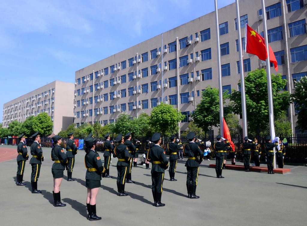 入場儀式完畢,全場起立。在雄壯的國歌聲中,大會舉行了莊嚴(yán)的升旗儀式,隨著五星紅旗冉冉升起,全場師生齊唱國歌。
