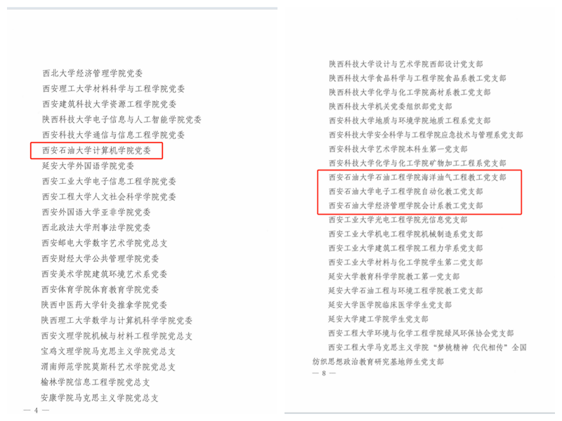 中共陜西省委教育工委下發(fā)《關(guān)于公布第四批陜西高校黨建工作示范高校、標(biāo)桿院系、樣板支部培育創(chuàng)建名單的通知》(陜教工函〔2024〕59號(hào)),計(jì)算機(jī)學(xué)院黨委入選陜西高校黨建工作“標(biāo)桿院系”,石油工程學(xué)院海洋油氣工程教工黨支部、電子工程學(xué)院自動(dòng)化教工黨支部、經(jīng)濟(jì)管理學(xué)院會(huì)計(jì)系教工黨支部入選陜西高校黨建工作“樣板支部”。