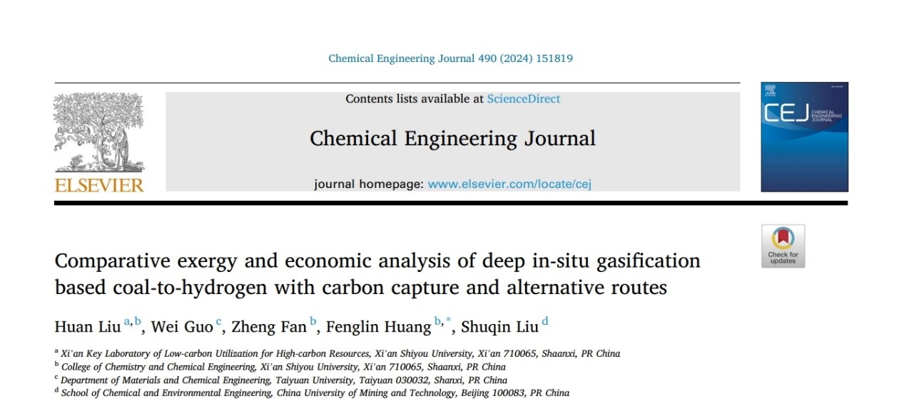 近日,我?;瘜W化工學院黃風林科研團隊以青年教師劉歡為第一作者、黃風林為通訊作者,西安石油大學為第一署名單位在工程技術(shù)與化工領域最有影響力的三大頂級刊物之一《Chemical Engineering Journal》(JCR、中科院分區(qū)雙一區(qū)TOP期刊,IF=15.1)上發(fā)表題為《Comparative exergy and economic analysis of deep in-situ gasification based coal-to-hydrogen with carbon capture and alternative routes》的高水平論文。
