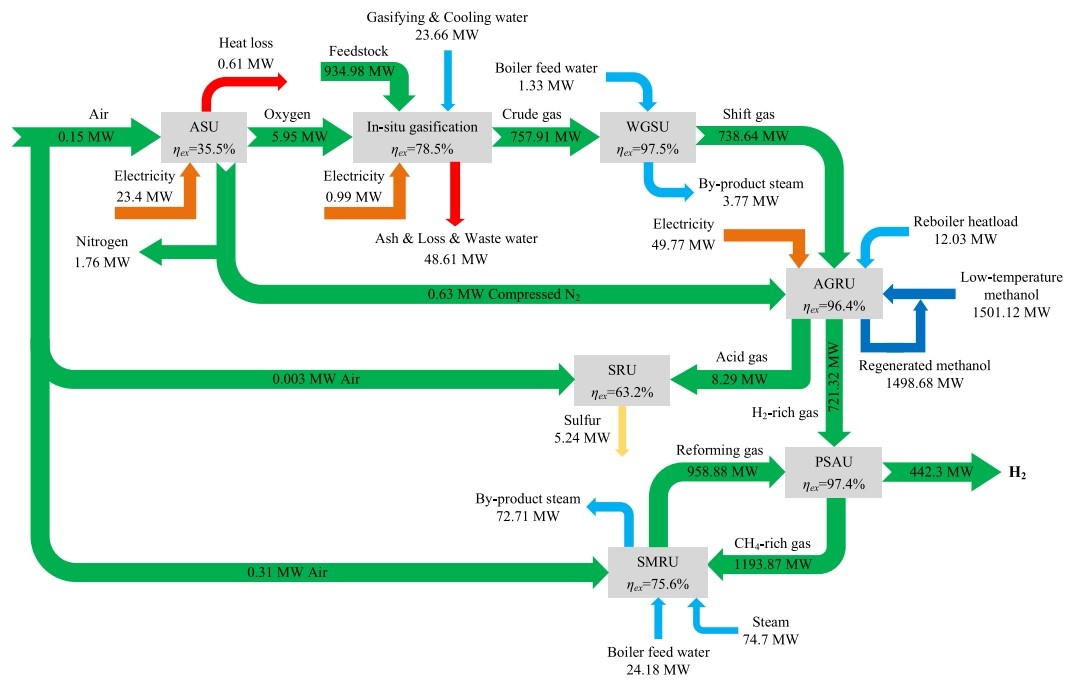 深部煤炭原位氣化制氫作為一種潛在的規(guī)?;夹g(shù)路線,工業(yè)化應用前利用熱力學手段分析其能量轉(zhuǎn)化、利用過程的特點,預測系統(tǒng)用能的薄弱環(huán)節(jié),可為后續(xù)工藝過程、工藝參數(shù)耦合優(yōu)化提供指導。與現(xiàn)有基于化石能源路線間效率、經(jīng)濟性等方面的定量化分析是提高競爭力,明確技術(shù)可行性與應用前景的核心關鍵。