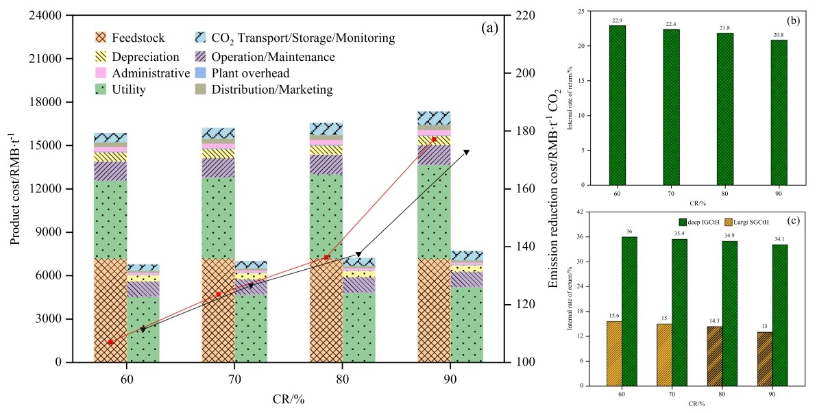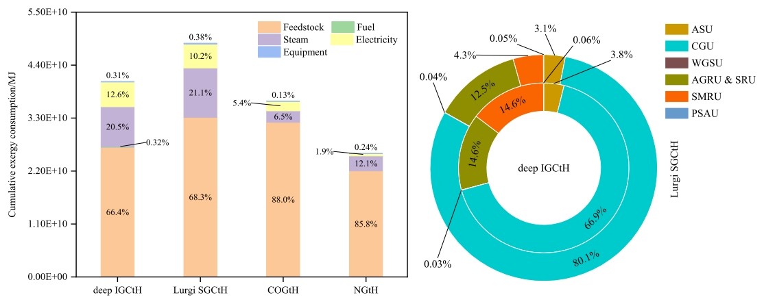 該成果基于世界上唯一的千米級深部煤炭原位氣化試驗數(shù)據(jù),運用?分析方法,以?平衡方程為基礎,結(jié)合過程模擬手段,計算了深部煤炭原位氣化制氫從原煤開始到氫氣產(chǎn)品產(chǎn)出的?損失、分布,將?損失細分為可避免/不可避免內(nèi)部損失與可避免/不可避免外部損失四類,進一步分析用能薄弱環(huán)節(jié),確定提高?效率的方法、手段。同時,針對傳統(tǒng)?分析方法視角下效率指標存在?不等價與無法計入非連續(xù)投入能量等問題,創(chuàng)新提出以考慮設備因素的積累?消耗(CExC)作為衡量過程?效率的指標,據(jù)此明確深部煤炭原位氣化制氫在效率方面的競爭力。結(jié)果表明,深部煤炭原位氣化制氫?損失中存在39.9%的不可避免,而甲烷重整和深部地下氣化具有最大的改進潛力,充分說明通過改進其他過程單元或優(yōu)化工藝結(jié)構(gòu)可實現(xiàn)熱力學性能的改善。在產(chǎn)出每千克氫氣時深部煤炭原位氣化制氫的CExC僅為傳統(tǒng)煤炭地面氣化制氫的83.6%,表明其是一種更高效的路線,優(yōu)勢隨著規(guī)模的增大會更加明顯,同時投資、成本方面相比后者也具有顯著優(yōu)勢。