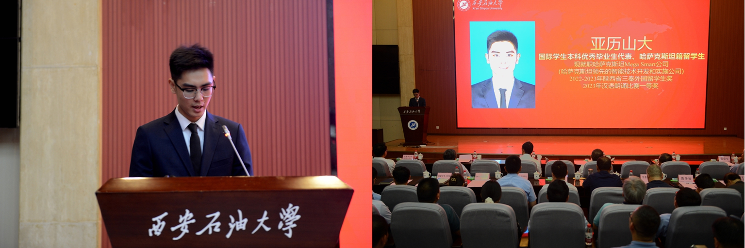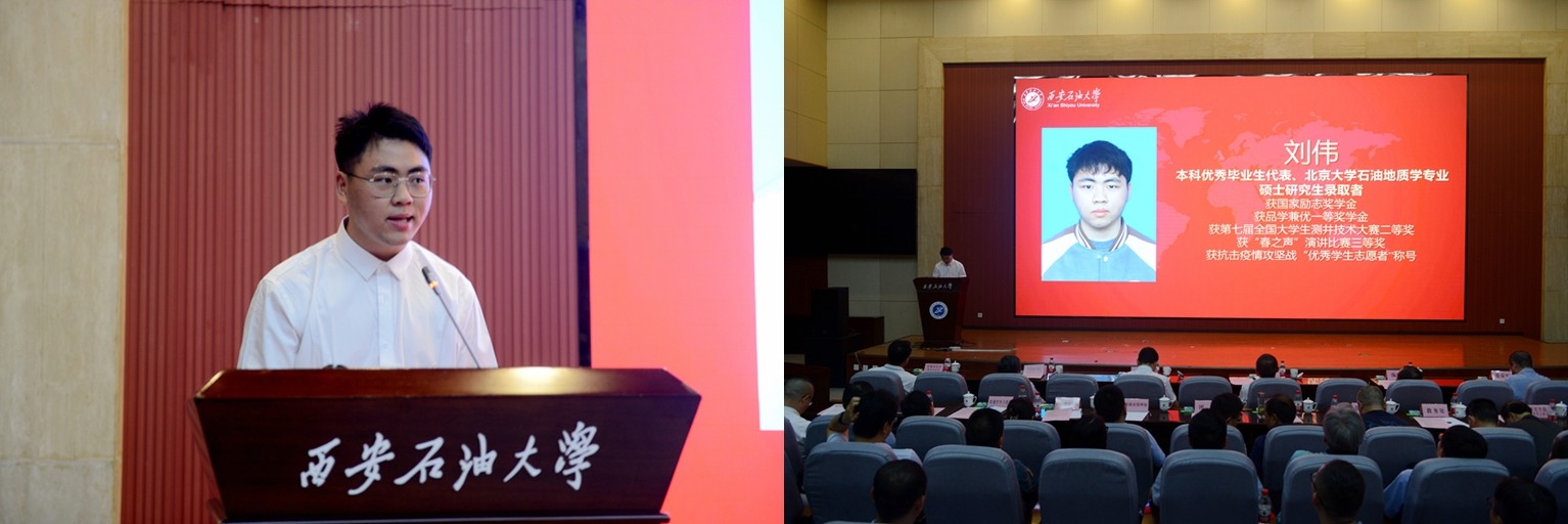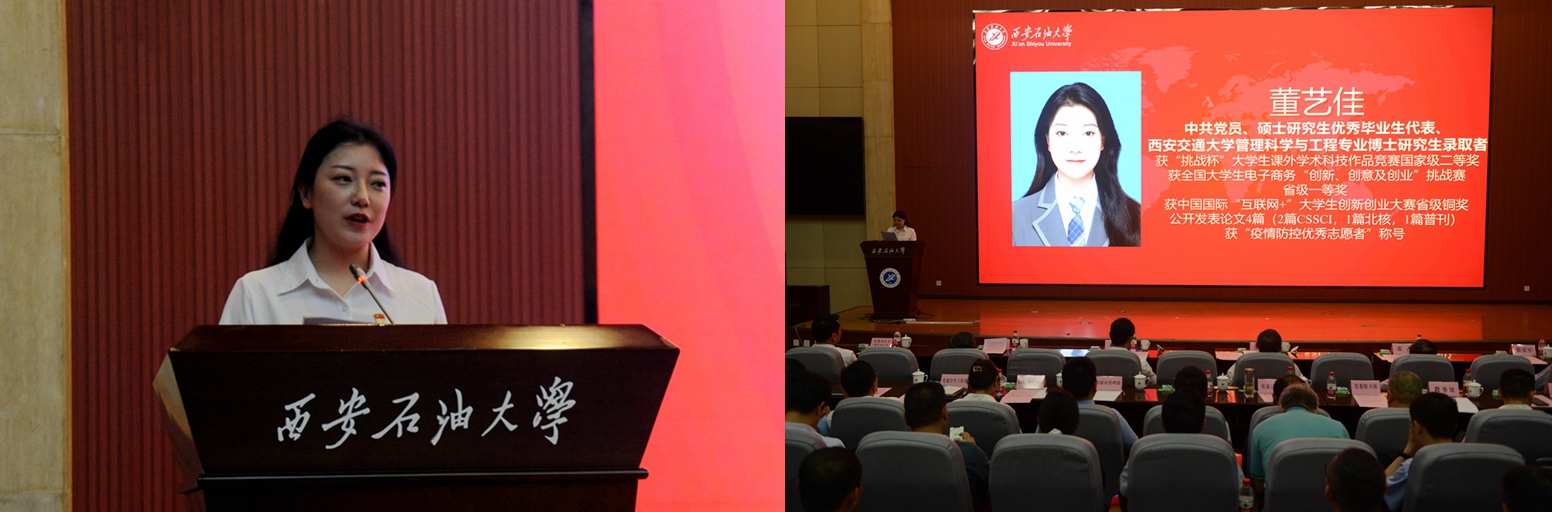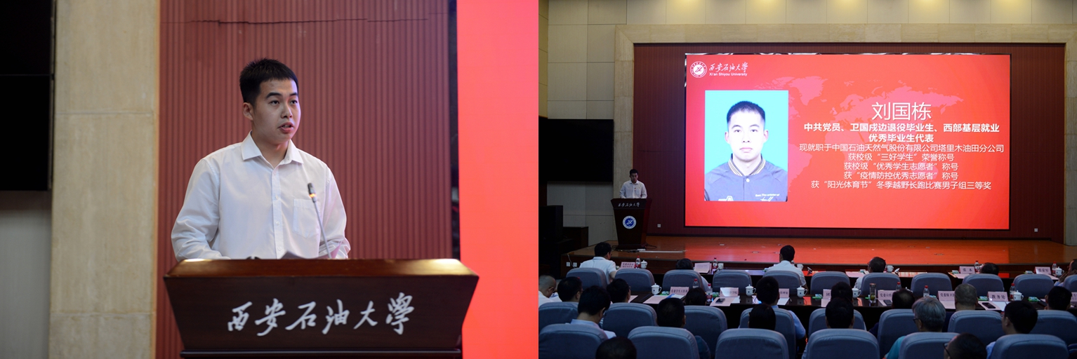 中共黨員、陜西省大學(xué)生自強(qiáng)之星、陜西好青年榮譽(yù)稱號(hào)獲得者,石油工程學(xué)院學(xué)生梁歡;本科優(yōu)秀畢業(yè)生代表、北京大學(xué)石油地質(zhì)學(xué)專業(yè)碩士研究生錄取者,地球科學(xué)與工程學(xué)院學(xué)生劉偉;國(guó)際學(xué)生本科優(yōu)秀畢業(yè)生代表、哈薩克斯坦籍留學(xué)生,國(guó)際教育學(xué)院學(xué)生亞歷山大;中共黨員、碩士研究生優(yōu)秀畢業(yè)生代表、西安交通大學(xué)管理科學(xué)與工程專業(yè)博士研究生錄取者,經(jīng)濟(jì)管理學(xué)院學(xué)生董藝佳;中共黨員、衛(wèi)國(guó)戍邊退役畢業(yè)生代表、西部基層就業(yè)優(yōu)秀畢業(yè)生代表,石油工程學(xué)院學(xué)生劉國(guó)棟分別作了交流發(fā)言。