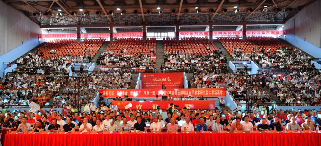 7月27日上午,學(xué)校在雁塔校區(qū)體育館隆重舉行了恢復(fù)辦學(xué)首屆學(xué)生畢業(yè)40周年紀(jì)念暨2024校友秩年返校共商高質(zhì)量發(fā)展大會。學(xué)校黨政領(lǐng)導(dǎo)常江、王進富、張木、王輝強、程永清、楊戰(zhàn)社、張榮軍、張君濤、張驍勇、趙健、樊曉民出席會議,校友代表、校友家屬、各地校友分會負(fù)責(zé)人代表、校友企業(yè)家聯(lián)合會代表、歷任校領(lǐng)導(dǎo)代表,各職能部門和院(系)負(fù)責(zé)人、教師代表和在校生代表共計1200余人參加會議。