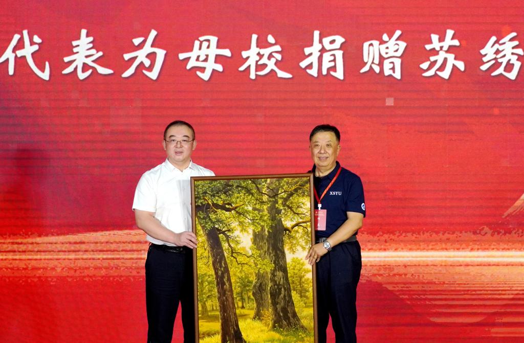 廠80級校友崔曉明為母校捐贈蘇繡《三棵樹》,表達對母校的祝福,常江代表學(xué)校接受捐贈,感謝80級校友對母校的深厚情誼。