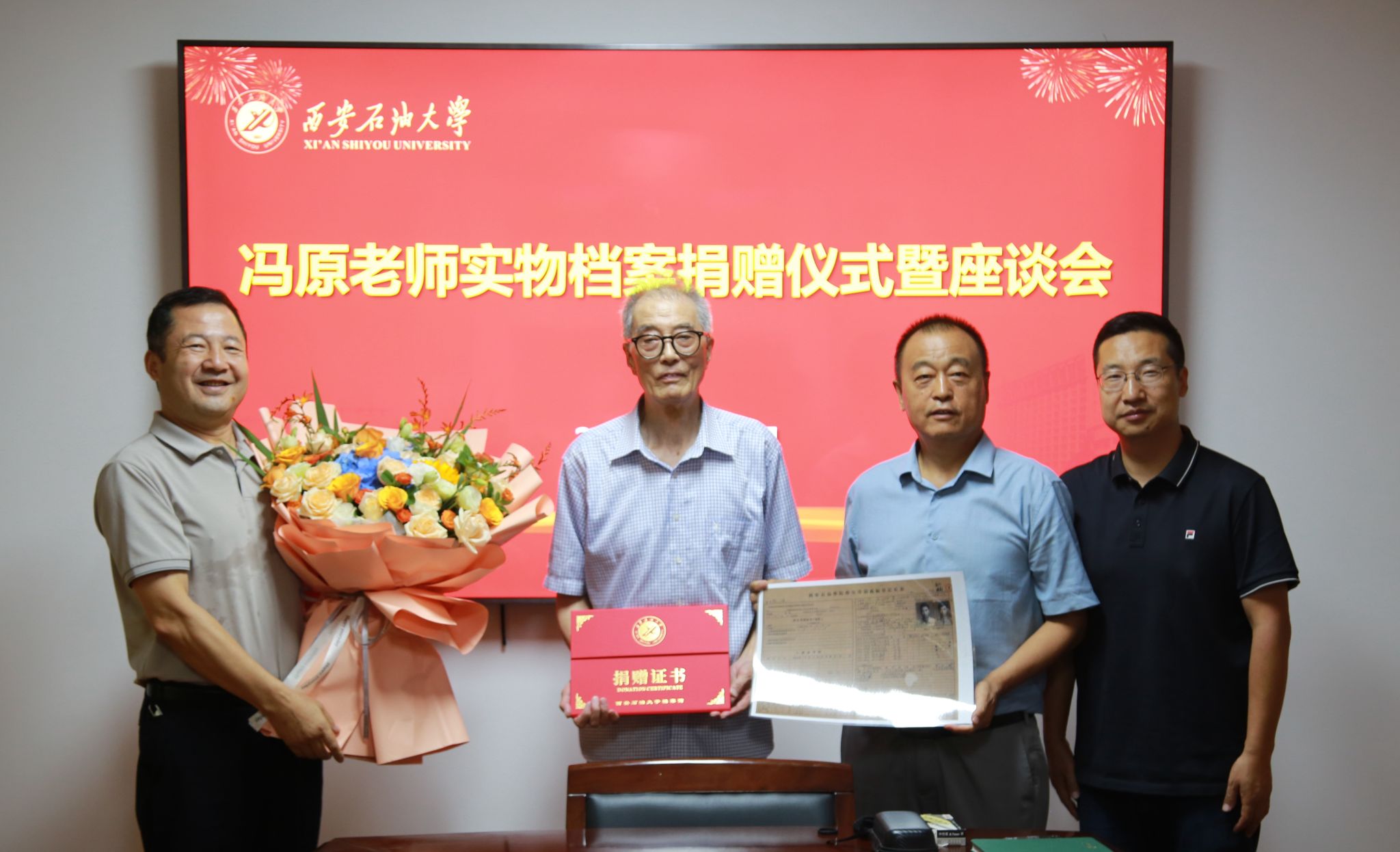 程永清強調(diào),馮老師是學校的老校友,是我們的老前輩,其懷著對學校無比真摯的感情將一批珍貴實物檔案捐贈給檔案館,我們一定要保護好、利用好,銘記老一代西石大人對學校的貢獻。程永清代表學校感謝馮老師對學校的關(guān)愛。他表示,老同志們對學校的發(fā)展給予厚望,我們一定要接好接力棒,擔負起歷史使命,大力傳承紅色血脈,發(fā)揚西安石油大學老一代教師的優(yōu)良品質(zhì),講好西安石油大學故事,為早日將學校建成特色鮮明高水平教學研究型大學而努力奮斗。