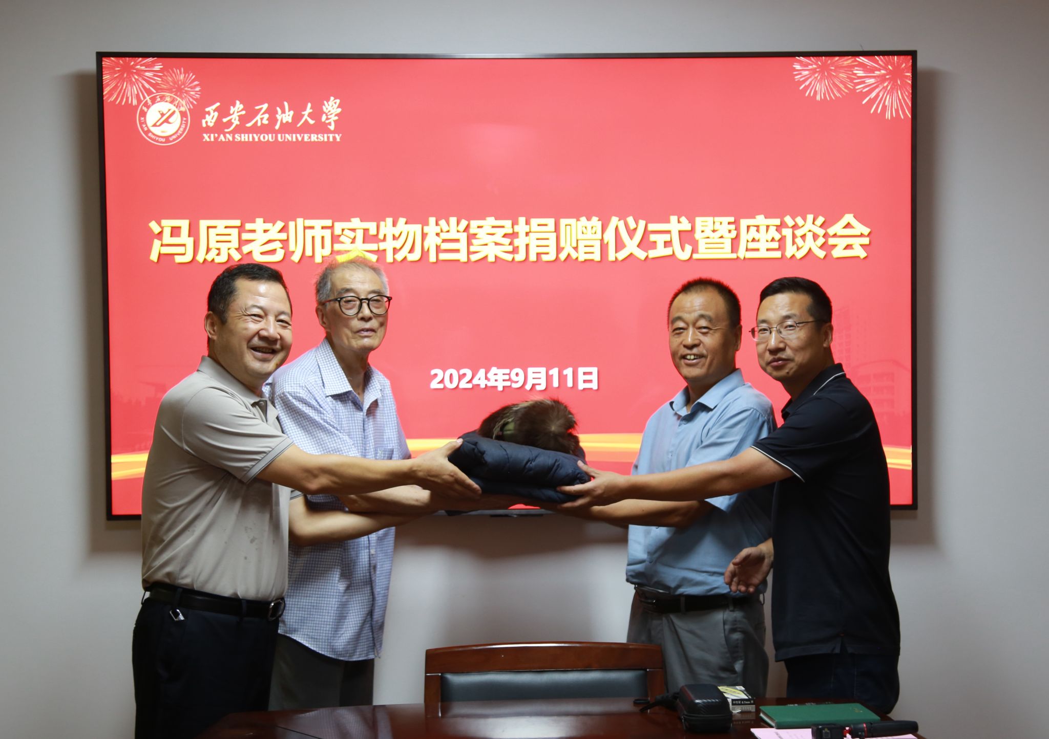 9月11日下午,我校退休教職工馮原老師向?qū)W校捐贈“新時期鐵人”王啟民為校慶50周年題詞、大慶會戰(zhàn)期間的工服鞋帽、西安石油學院畢業(yè)證書、老照片等珍貴實物檔案。檔案捐贈儀式在雁塔校區(qū)行政樓二樓會議室舉行,會議由檔案館館長馬超主持,校黨委副書記程永清,離退休工作處主要負責人及相關(guān)工作人員參加會議。