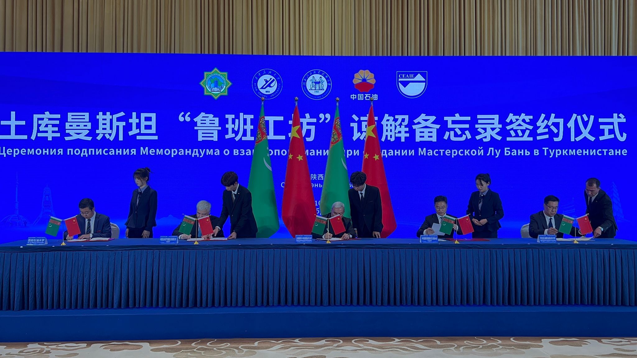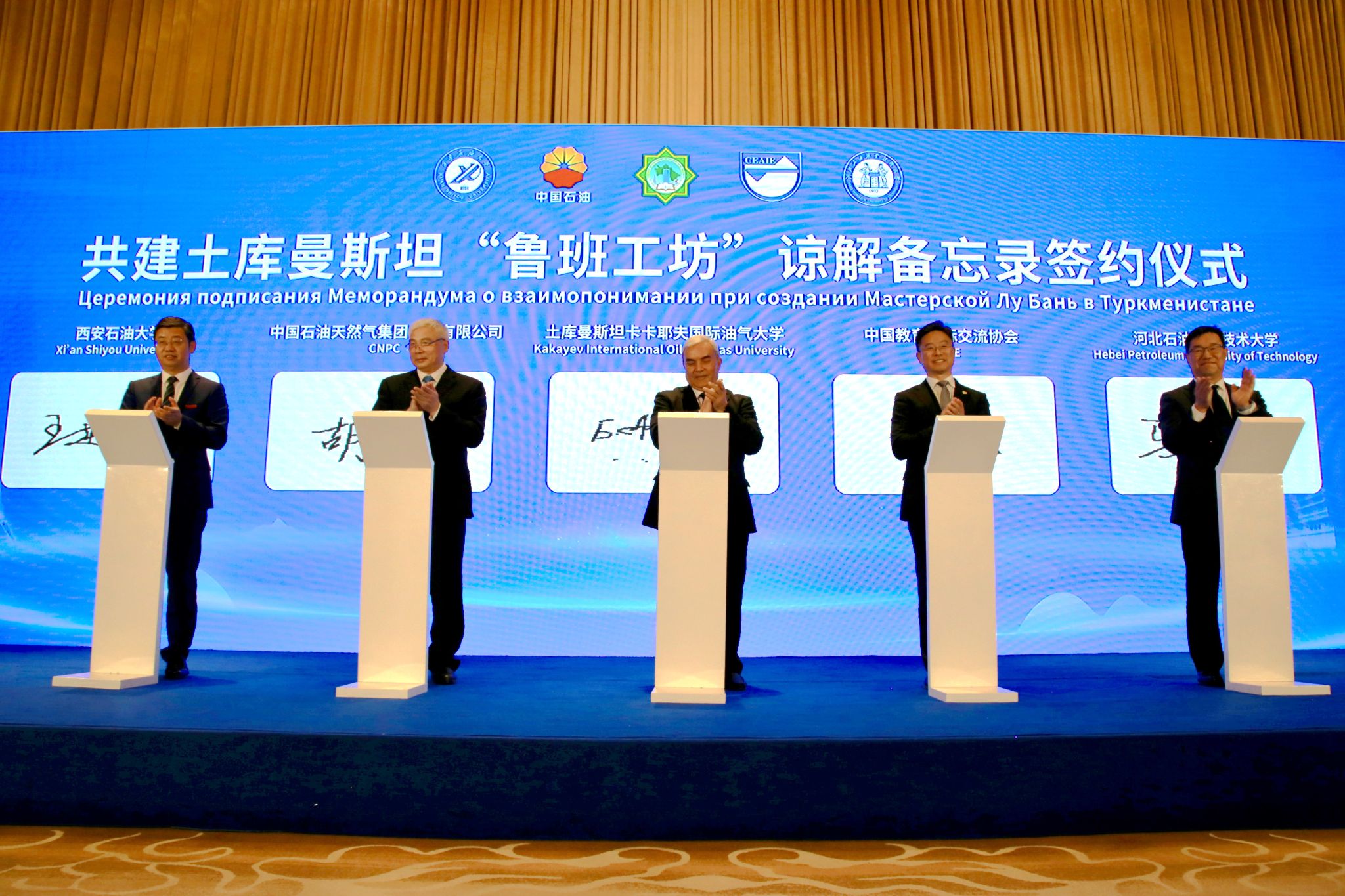 18日下午,共建土庫曼斯坦“魯班工坊”諒解備忘錄簽約儀式在陜西賓館成功舉行。土庫曼斯坦卡卡耶夫油氣大學(xué)校長(zhǎng)拜拉姆穆拉特·阿塔馬諾夫、西安石油大學(xué)校長(zhǎng)王進(jìn)富、河北石油職業(yè)技術(shù)大學(xué)副校長(zhǎng)馬顯才、中國(guó)教育國(guó)際交流協(xié)會(huì)秘書長(zhǎng)楊軍、中國(guó)石油天然氣集團(tuán)有限公司人力資源部副總經(jīng)理胡紅民分別代表中土共建各方共同簽署《土庫曼斯坦魯班工坊諒解備忘錄》。