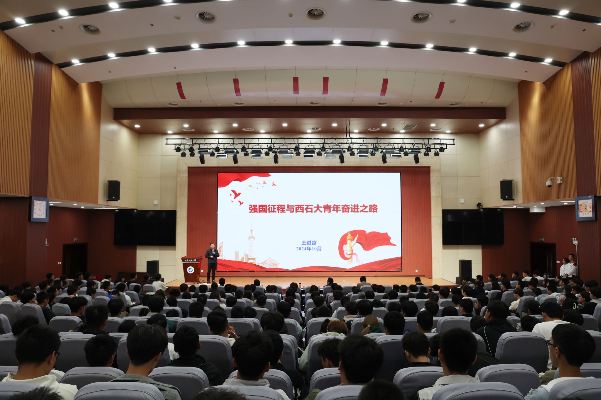 10月23日下午,校長(zhǎng)王進(jìn)富在鄠邑校區(qū)弘石報(bào)告廳為地球科學(xué)與工程學(xué)院師生講授題為“強(qiáng)國(guó)征程與西石大青年奮進(jìn)之路”的專題思政課。地球科學(xué)與工程學(xué)院負(fù)責(zé)人、全體學(xué)工干部及400余名學(xué)生參加。