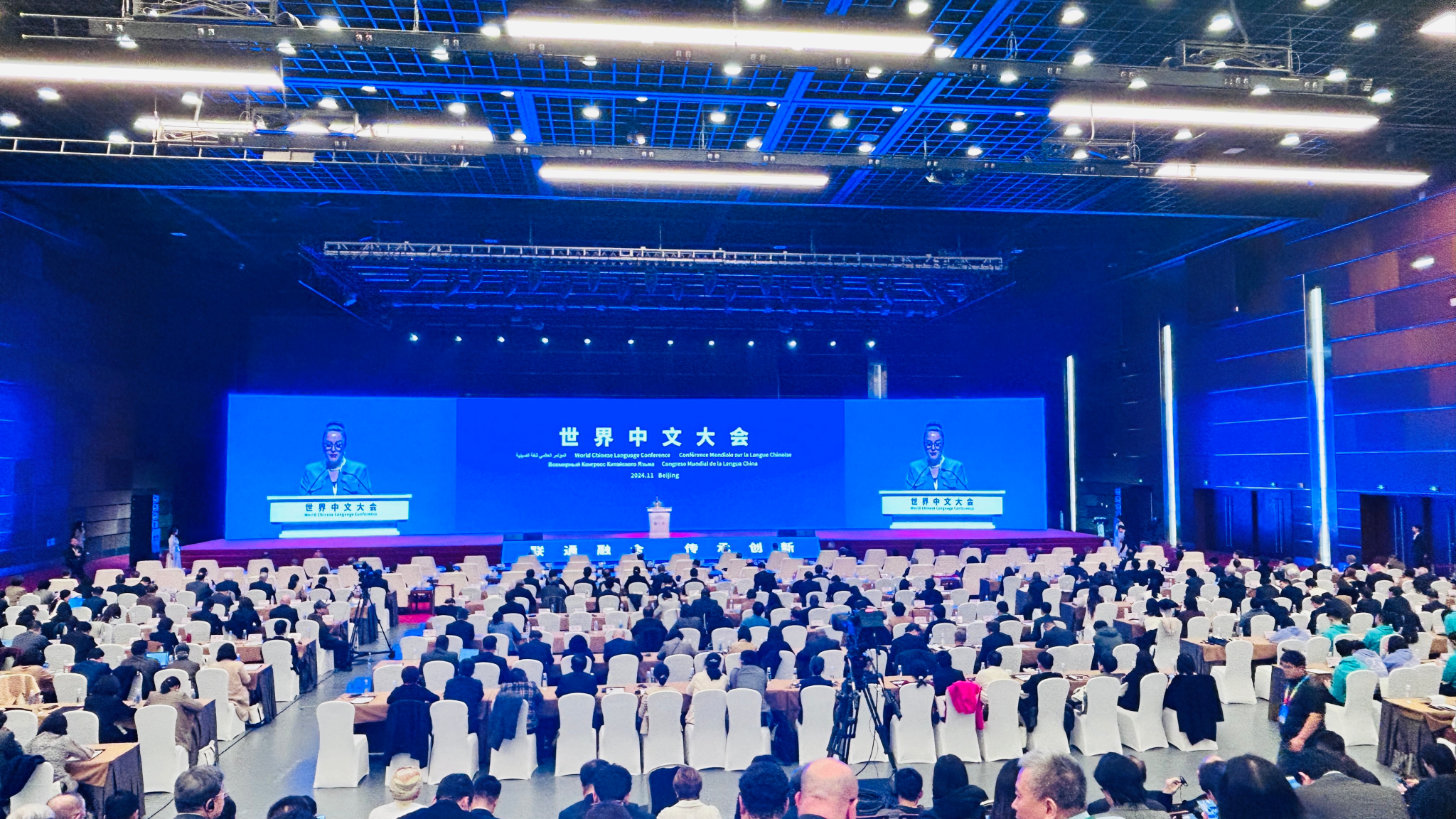 2024世界中文大會由中國教育部主辦,主題為“聯通融合 傳承創(chuàng)新”,白俄羅斯中國友好協(xié)會主席、前副總理托濟克,柬埔寨副首相兼教育、青年和體育部部長韓春納洛等中外代表在大會上發(fā)言。來自160余個國家和地區(qū)的2000多名政府官員、校長、專家學者、師生代表和駐華使節(jié)等出席會議。