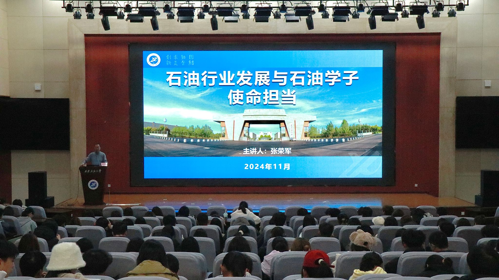11月25日晚,副校長(zhǎng)張榮軍在鄠邑校區(qū)弘石報(bào)告廳為人文學(xué)院學(xué)生講授題為“石油行業(yè)發(fā)展與石油學(xué)子使命擔(dān)當(dāng)”的專題思政課,人文學(xué)院學(xué)生工作干部、2024級(jí)全體本科生參加。