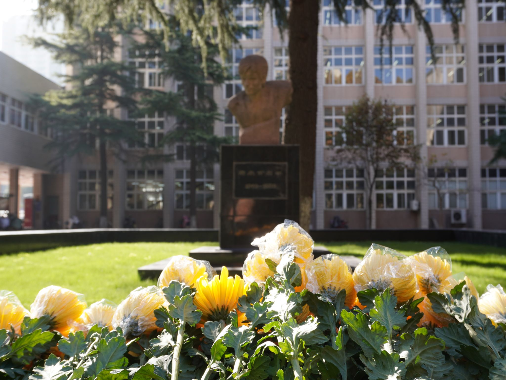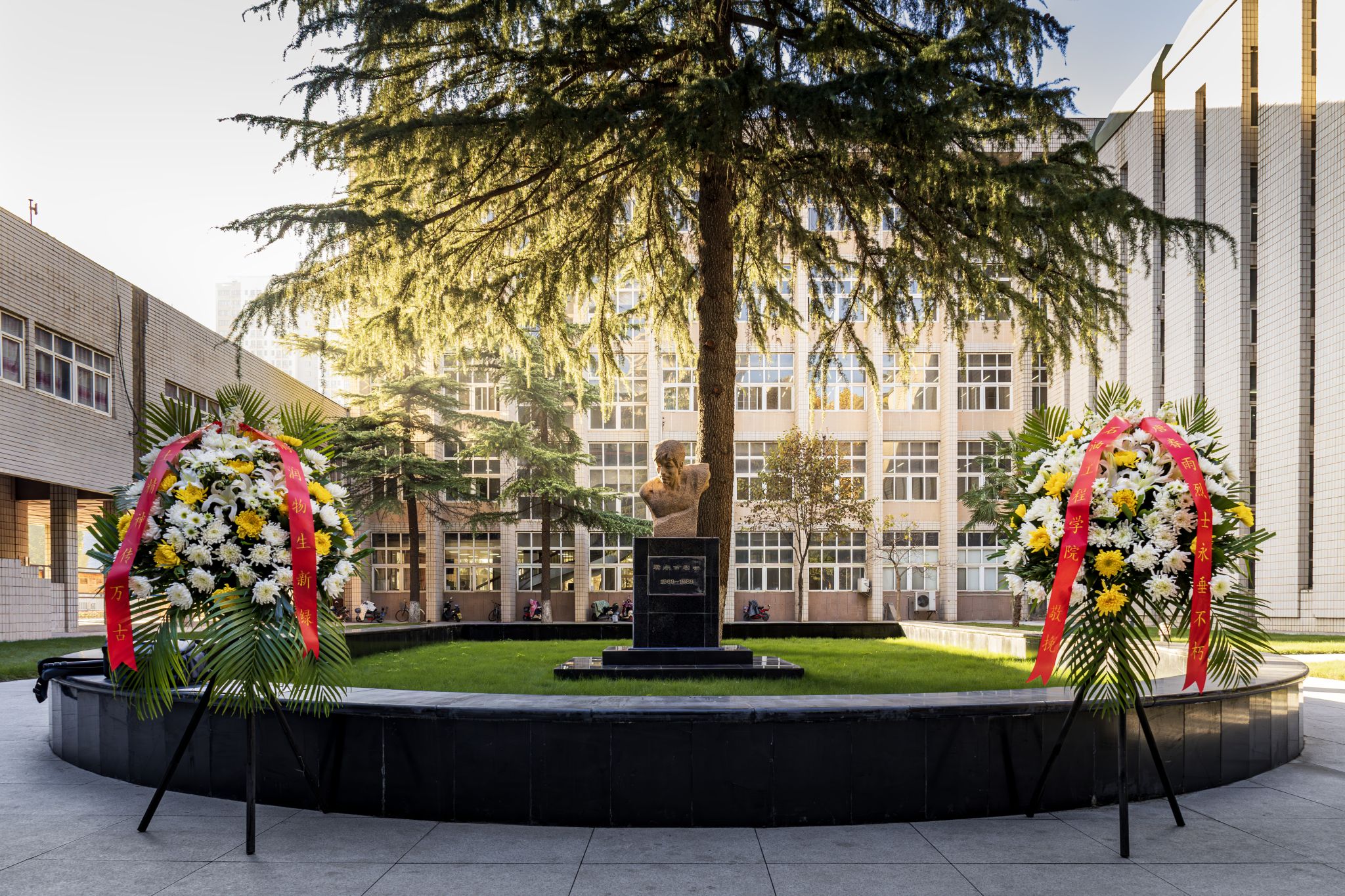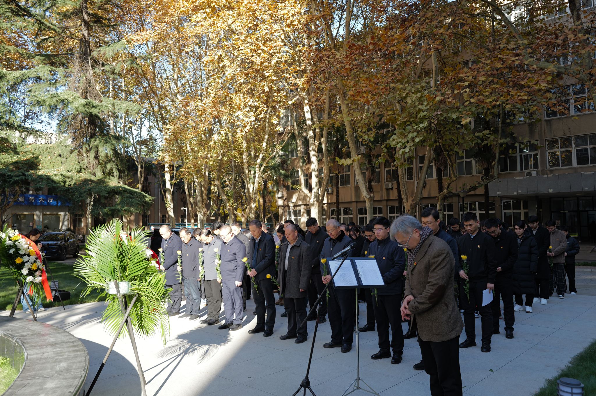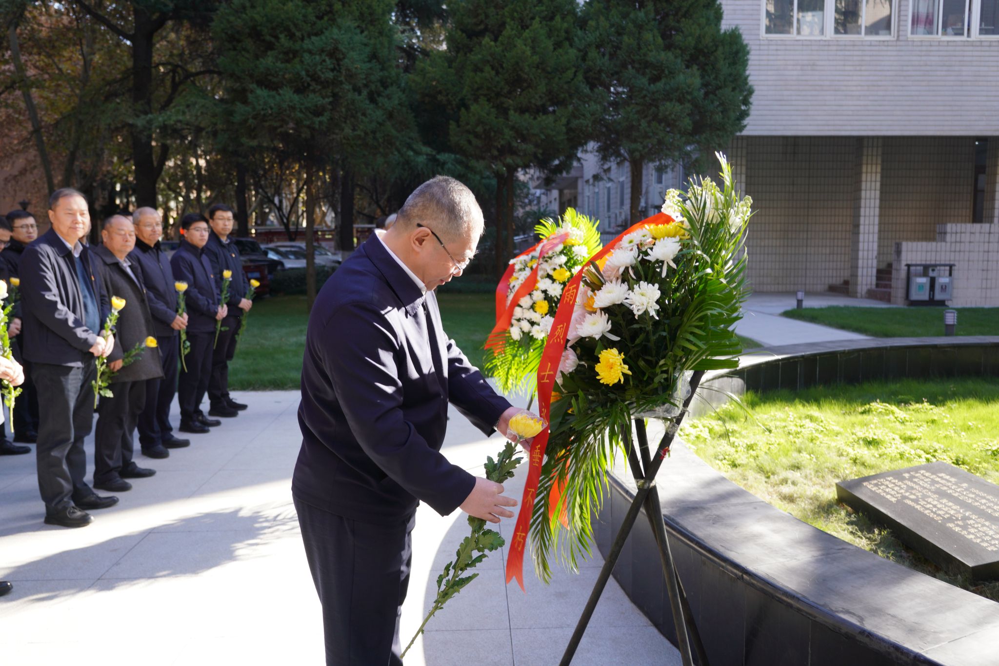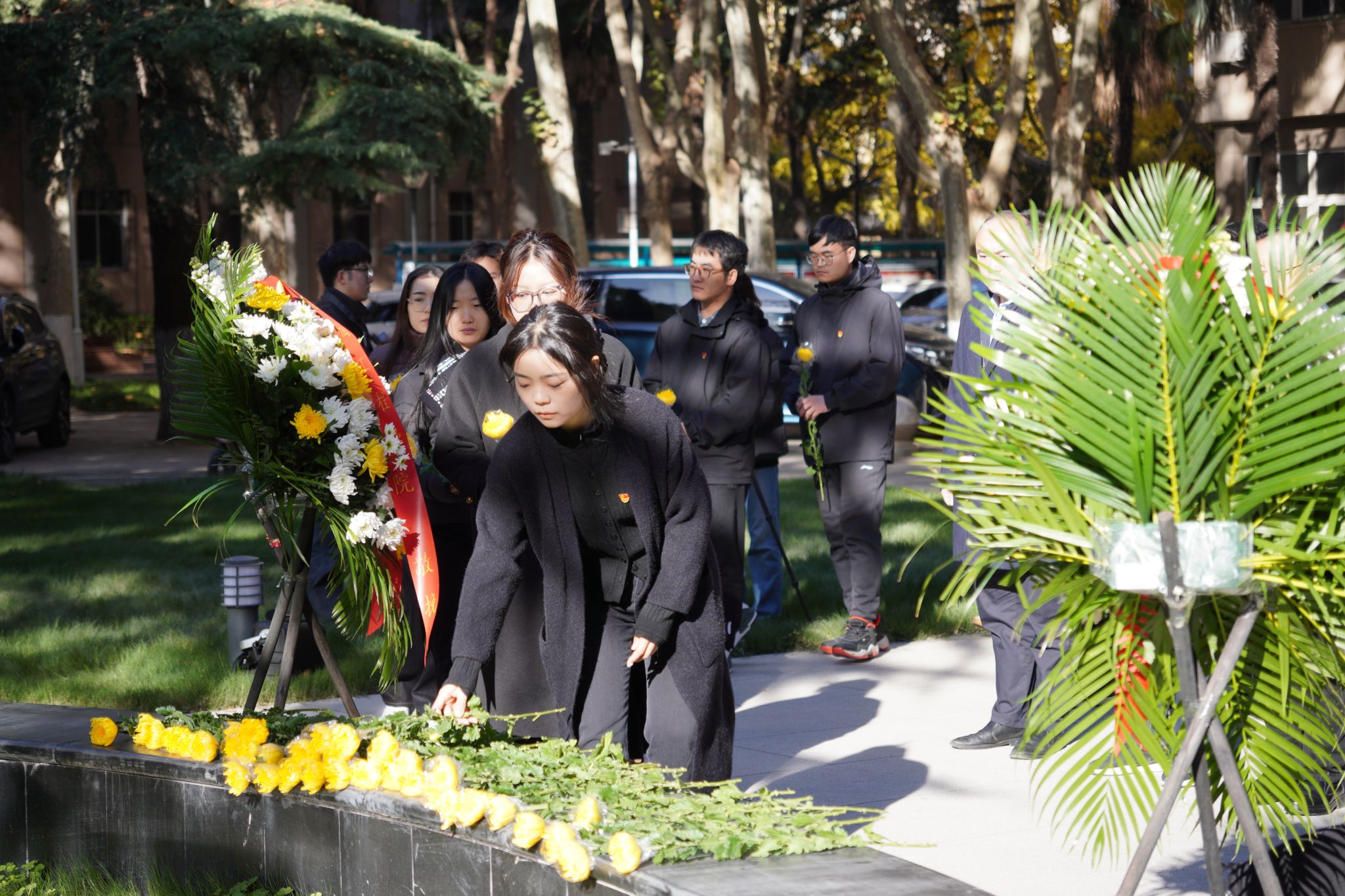 陽(yáng)光照耀下的唐春雨烈士塑像莊重祥和。全體師生瞻仰唐春雨烈士塑像,默哀一分鐘。常江緩步向前整理了花圈挽聯(lián),隨后全體師生依次向唐春雨烈士敬獻(xiàn)鮮花,鞠躬致敬。