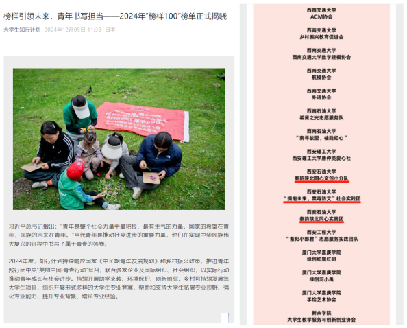 近日,團(tuán)中央學(xué)校部揭曉了2024年“榜樣100”全國(guó)優(yōu)秀大學(xué)生團(tuán)隊(duì)及社團(tuán)榜單,我校秦韻陜北同心文創(chuàng)小分隊(duì)、“擁抱未來,禁毒防艾”社會(huì)實(shí)踐團(tuán)、秦韻陜北同心實(shí)踐團(tuán)三支團(tuán)隊(duì)入選“榜樣100”全國(guó)優(yōu)秀大學(xué)生團(tuán)隊(duì)”。