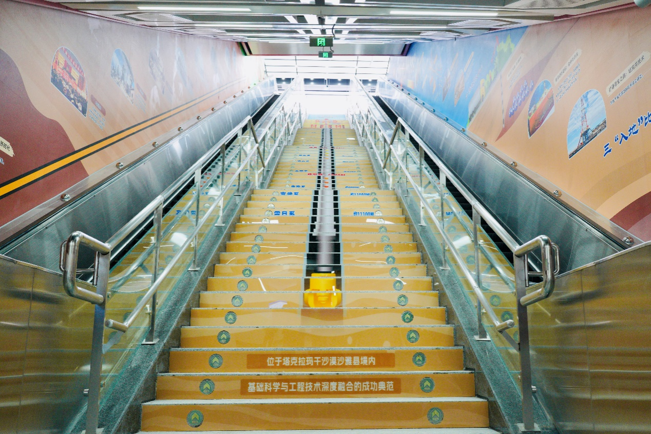 全部布展區(qū)域約102米,以模擬地下開采環(huán)境為背景,結(jié)合進(jìn)出站行進(jìn)路線,規(guī)劃了“七個(gè)場(chǎng)景”的布展內(nèi)容:1號(hào)墻“工業(yè)血液——中國石油工業(yè)的奮進(jìn)篇章”,依托進(jìn)站下行扶梯,再現(xiàn)了石油的最早記錄和中國石油工業(yè)從起步到壯大的輝煌歷程,展示了我國在石油技術(shù)、裝備、合作等領(lǐng)域的新突破;2號(hào)墻“石油七十二變”,依托長廊側(cè)面,展示了石油在生產(chǎn)生活中的具體應(yīng)用場(chǎng)景;3號(hào)墻依托出站時(shí)映入眼簾的正面墻,展示了習(xí)近平總書記關(guān)于國家能源安全的重要論述,同時(shí)融入我校鄠邑校區(qū)經(jīng)典元素剪影(北大門、圖書館、終南山);4號(hào)墻“衣食住行的萬金油”,依托進(jìn)站下樓時(shí)首先映入眼簾的正面墻體,以趣味數(shù)字量化人們?cè)谏钪惺褂玫氖?;?號(hào)墻遠(yuǎn)端,強(qiáng)調(diào)展出了“為祖國加油、為民族爭(zhēng)氣”和“石油精神辦學(xué) 鐵人精神育人 延安精神鑄魂”的理念;5號(hào)墻“西石大智慧”是離出站口最近的必經(jīng)墻體,展示了我校優(yōu)秀科研成果服務(wù)國家重大應(yīng)用場(chǎng)景;6號(hào)墻“油氣產(chǎn)業(yè)鏈全景探索”,依托出站上行扶梯墻體,對(duì)油氣產(chǎn)業(yè)上中下游進(jìn)行了全階段科普展示;最后,利用出站樓梯的側(cè)立面,立體展示了亞洲第一最深直井、我國首口萬米科探井(深地塔科一井)的探地效果和地球的年代地層。
