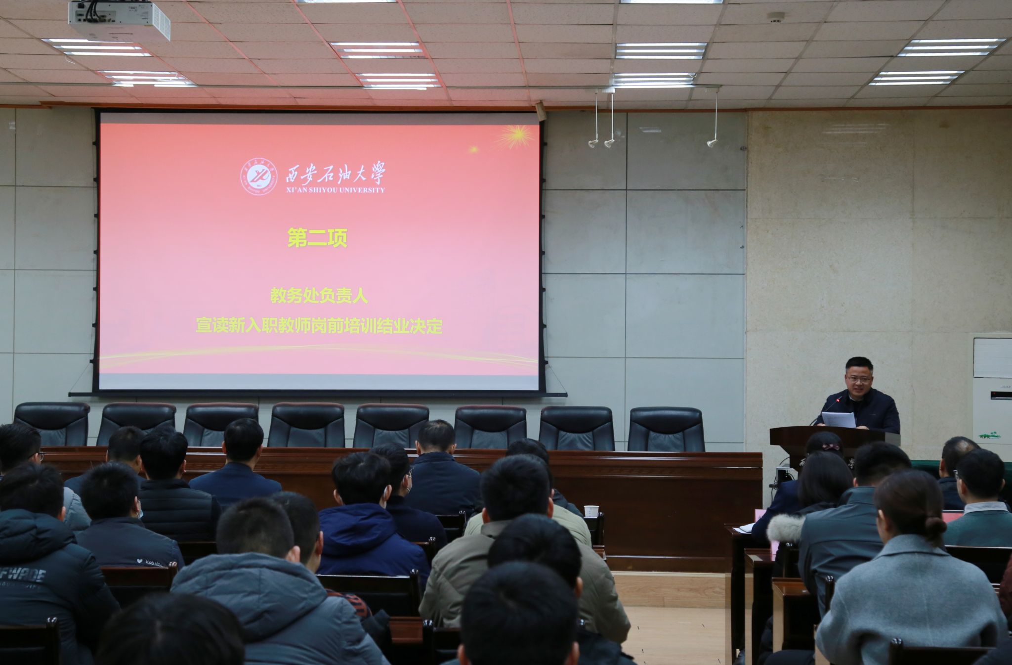 教務處副處長馬加傳宣讀了《關于準予王海洋、李軍等104名新入職教師崗前培訓結(jié)業(yè)的決定》。