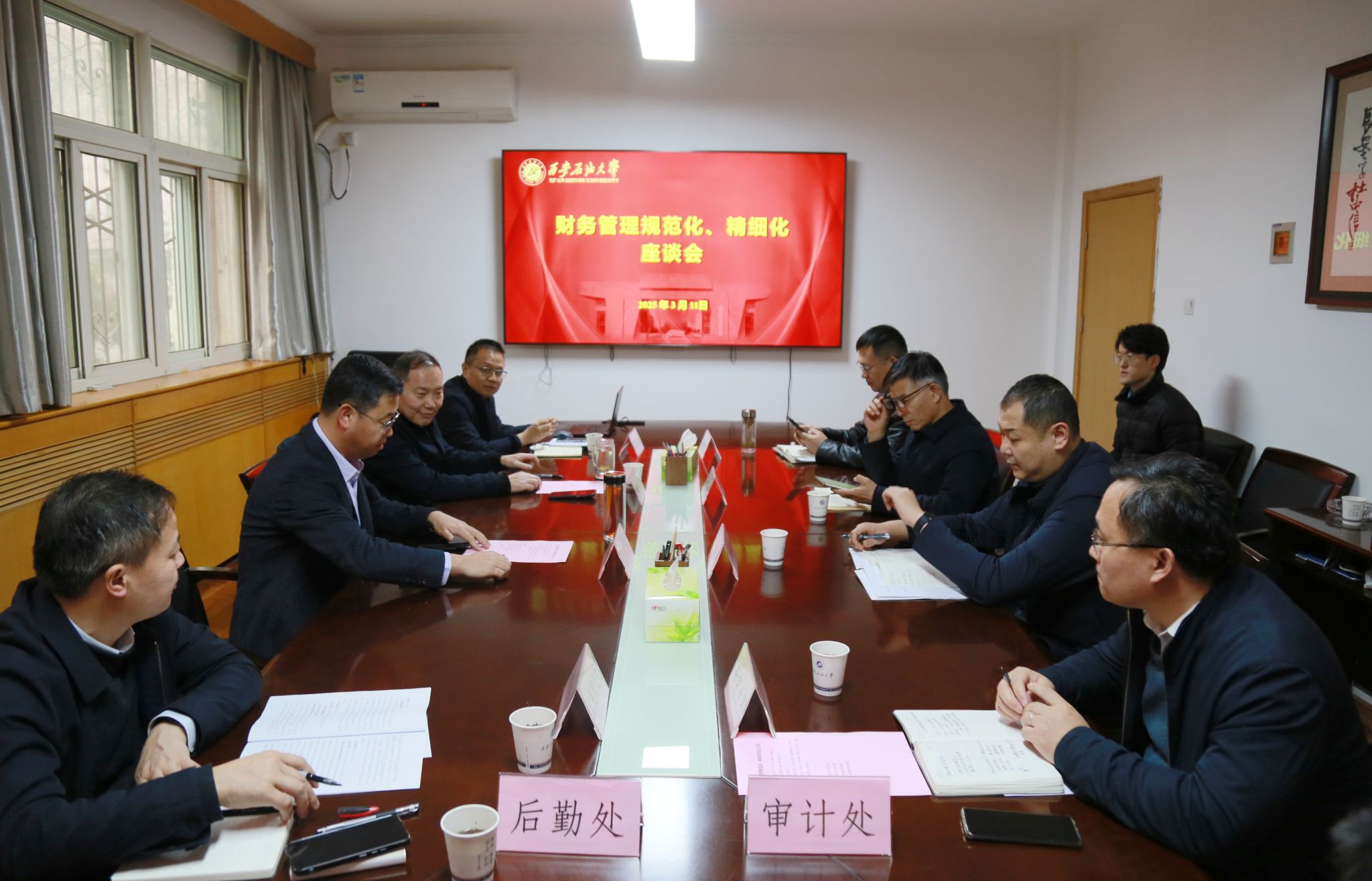 2025年3月11日,學(xué)校財務(wù)管理規(guī)范化、精細化座談會議在雁塔校區(qū)行政樓二樓會議室召開。會議由校長王進富主持,黨委辦公室(校長辦公室)、發(fā)展規(guī)劃處、人事處、教務(wù)處、科研處、研究生院、財務(wù)處、審計處、后勤處主要負責(zé)人參加會議。
