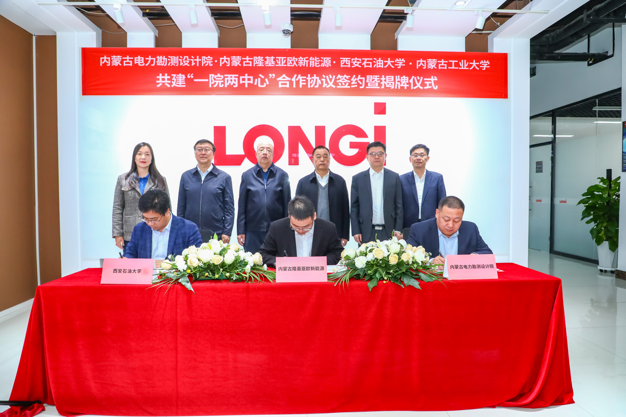 隨后,程永清一行來(lái)到內(nèi)蒙古隆基亞歐總部,應(yīng)邀參加了“內(nèi)蒙古電力勘測(cè)設(shè)計(jì)院·內(nèi)蒙古隆基亞歐新能源·西安石油大學(xué)·內(nèi)蒙古工業(yè)大學(xué)共建‘一院兩中心’合作協(xié)議簽約暨揭牌儀式”。