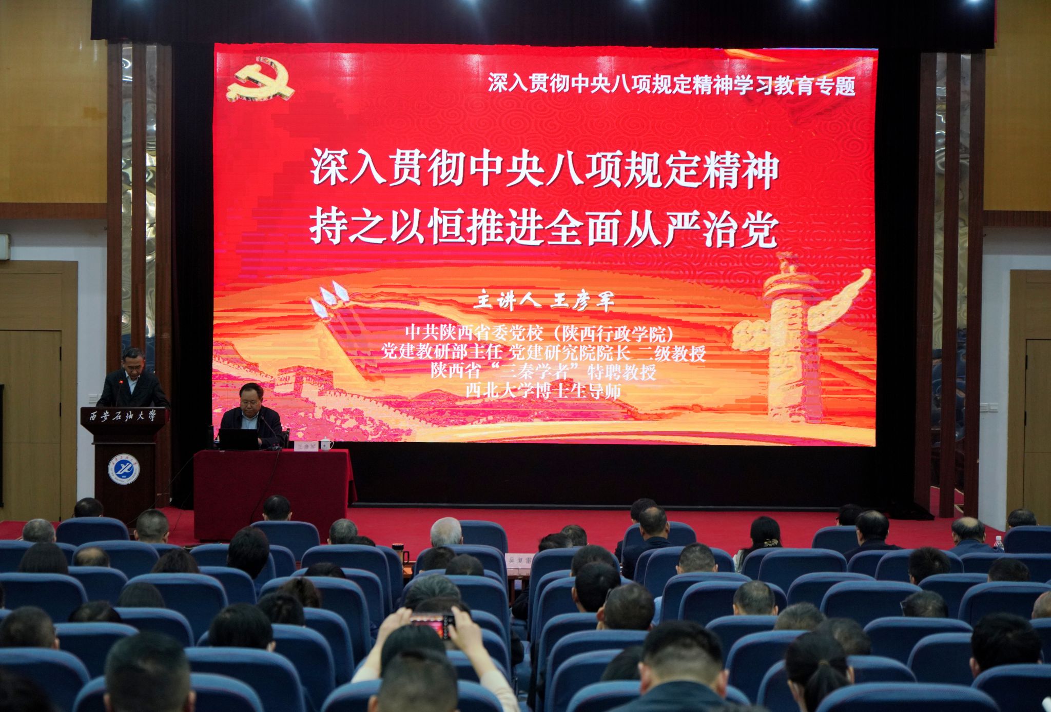會(huì)上,王彥軍教授以《深入貫徹中央八項(xiàng)規(guī)定精神持之以恒推進(jìn)全面從嚴(yán)治黨》為題,深入剖析了深入貫徹中央八項(xiàng)規(guī)定精神學(xué)習(xí)教育的時(shí)代背景,闡明了黨的十八大以來以習(xí)近平同志為核心的黨中央圍繞保持黨同人民群眾的血肉聯(lián)系,鍥而不舍落實(shí)中央八項(xiàng)規(guī)定強(qiáng)化紀(jì)律約束的重要性和迫切性。從厲行勤儉節(jié)約、反對(duì)奢侈浪費(fèi)和奢靡之風(fēng)、廉潔從政以及工作作風(fēng)務(wù)實(shí)等方面全面論述了中央八項(xiàng)規(guī)定及其精神的主要內(nèi)容,細(xì)致梳理了習(xí)近平總書記關(guān)于作風(fēng)建設(shè)的重要論述,結(jié)合深入淺出的實(shí)例深刻解析了新時(shí)代黨的作風(fēng)建設(shè)“為什么抓”“抓什么”“怎么抓”的根本方向性問題,進(jìn)一步廓清了學(xué)習(xí)教育推動(dòng)管黨治黨走深走實(shí)的重要意義。