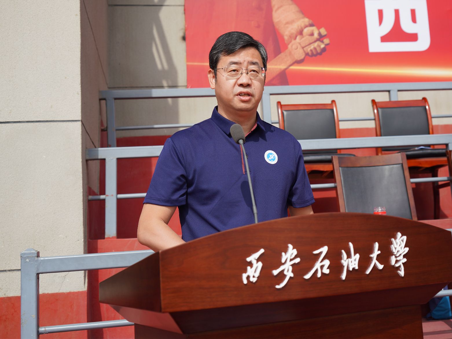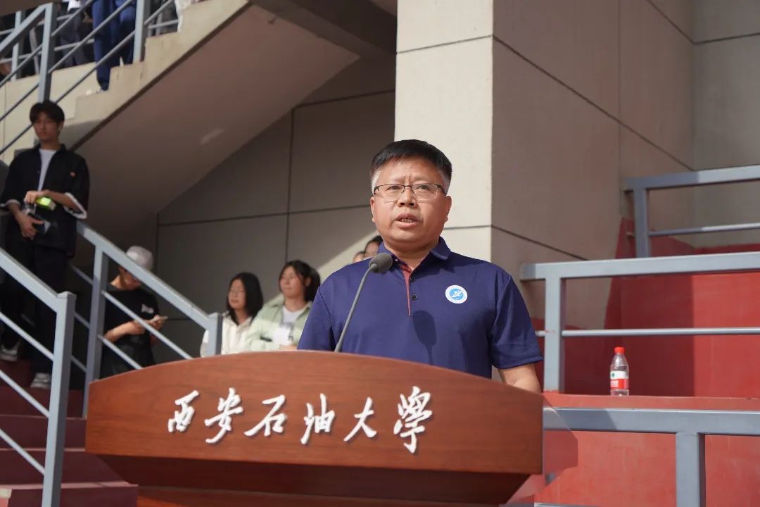 校長王進富代表學校致開幕詞。他向全體運動員、裁判員及工作人員致以崇高敬意,并回顧了過去一年學校體育事業(yè)的豐碩成果。他指出,從“三動計劃”點燃校園運動熱潮,到環(huán)校馬拉松2112名師生用腳步丈量能源熱土;從校運會刷新3項歷史紀錄,到競技團隊勇奪48項省級榮譽、首摘全國槳板聯(lián)賽金牌;從“陜西省排球訓練基地”掛牌到武術(shù)短兵培訓,西石大人始終以體育精神鑄魂育人,以實干擔當服務社會,書寫了踐行“健康中國”戰(zhàn)略的生動篇章。