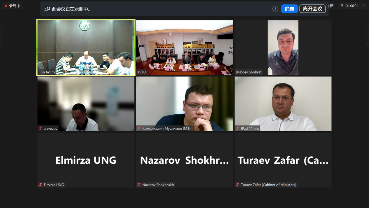 5月10日下午西石大烏茲別克斯坦分校建設(shè)第三次工作推進會在雁塔校區(qū)東方石油樓801舉行,會議以視頻方式進行。烏茲別克斯坦高等教育、科學(xué)與創(chuàng)新部副部長馬卡莫夫·奧塔別克·穆赫托羅維奇,內(nèi)閣辦公廳首席專家圖拉耶夫·扎法爾·卡赫拉莫諾維奇,能源部人力資源開發(fā)與管理司司長法伊濟耶夫·齊約杜拉·納斯魯拉耶維奇,能源部國際合作、評級與贈款引進司司長穆赫布博夫·馬克蘇德別克·諾濟姆忠·烏格里,高等教育、科學(xué)與創(chuàng)新部教育機構(gòu)許可與質(zhì)量保障司司長阿迪佐夫·桑扎爾,高等教育、科學(xué)與創(chuàng)新部國際合作與評級管理處處長約濟耶夫·戈利布忠,高等教育、科學(xué)與創(chuàng)新部國際司首席專家納扎羅夫·肖赫魯赫別克出席會議,會議由我校副校長張榮軍主持。