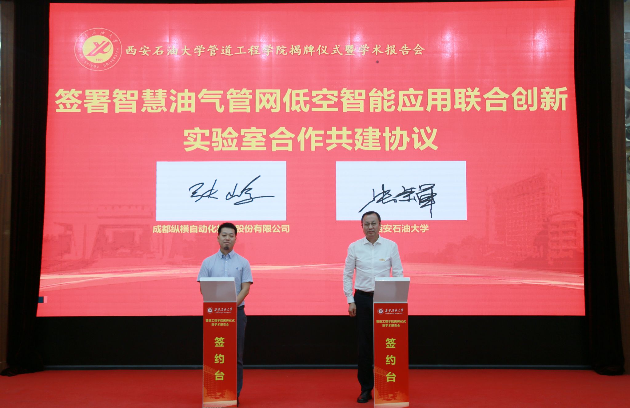 副校長張榮軍與成都縱橫自動化技術(shù)股份有限公司副總經(jīng)理張峻代表校企雙方簽署“智慧油氣管網(wǎng)低空智能應(yīng)用聯(lián)合創(chuàng)新實驗室”合作共建協(xié)議。
