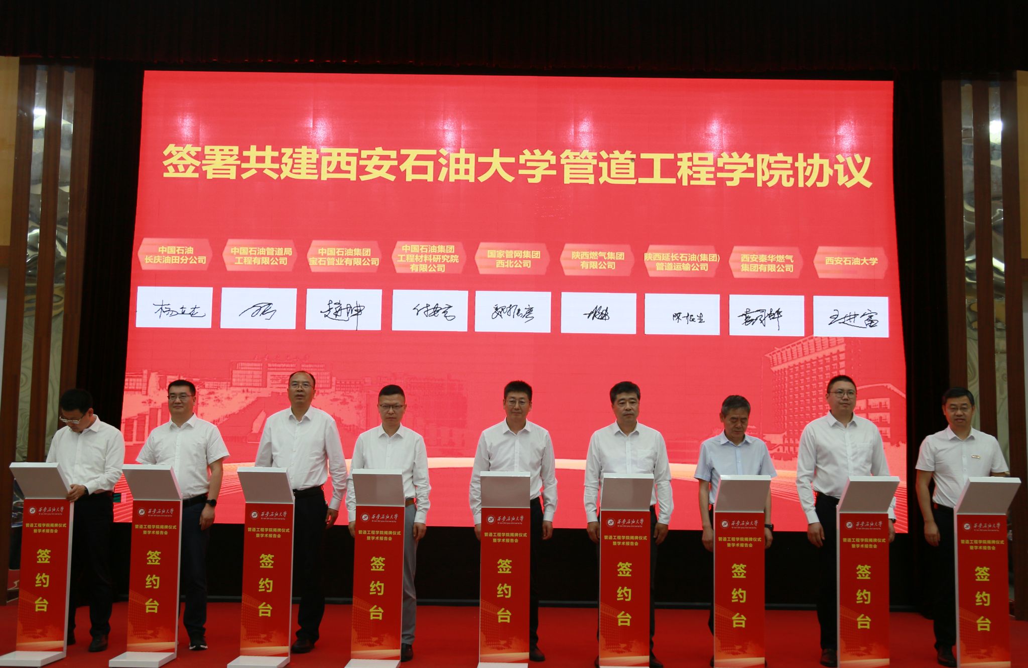 楊立龍副書記,劉廣仁副總經(jīng)理,趙坤首席專家,付安慶副總經(jīng)理,魏振宏副總經(jīng)理,胡恒進總工程師,陳根生總監(jiān),袁國輝副總經(jīng)理,校長王進富共同簽署共建管道工程學(xué)院協(xié)議。
