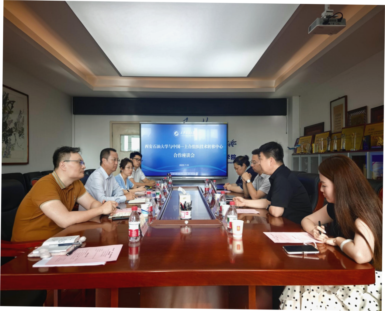 7月15日下午,中國(guó)—上合組織技術(shù)轉(zhuǎn)移中心(以下簡(jiǎn)稱“技術(shù)轉(zhuǎn)移中心”)國(guó)際交流與合作辦主任羅一鳴,技術(shù)轉(zhuǎn)移中心西安協(xié)同中心(籌)負(fù)責(zé)人、西安曲江新區(qū)人才交流中心黨支部書記、常務(wù)副主任、中國(guó)國(guó)際人才市場(chǎng)西安市場(chǎng)副主任何小奇等一行4人來(lái)校交流座談,雙方合作座談會(huì)在雁塔校區(qū)東方石油樓801會(huì)議室舉行。校黨委委員、副校長(zhǎng)張榮軍出席座談會(huì)。