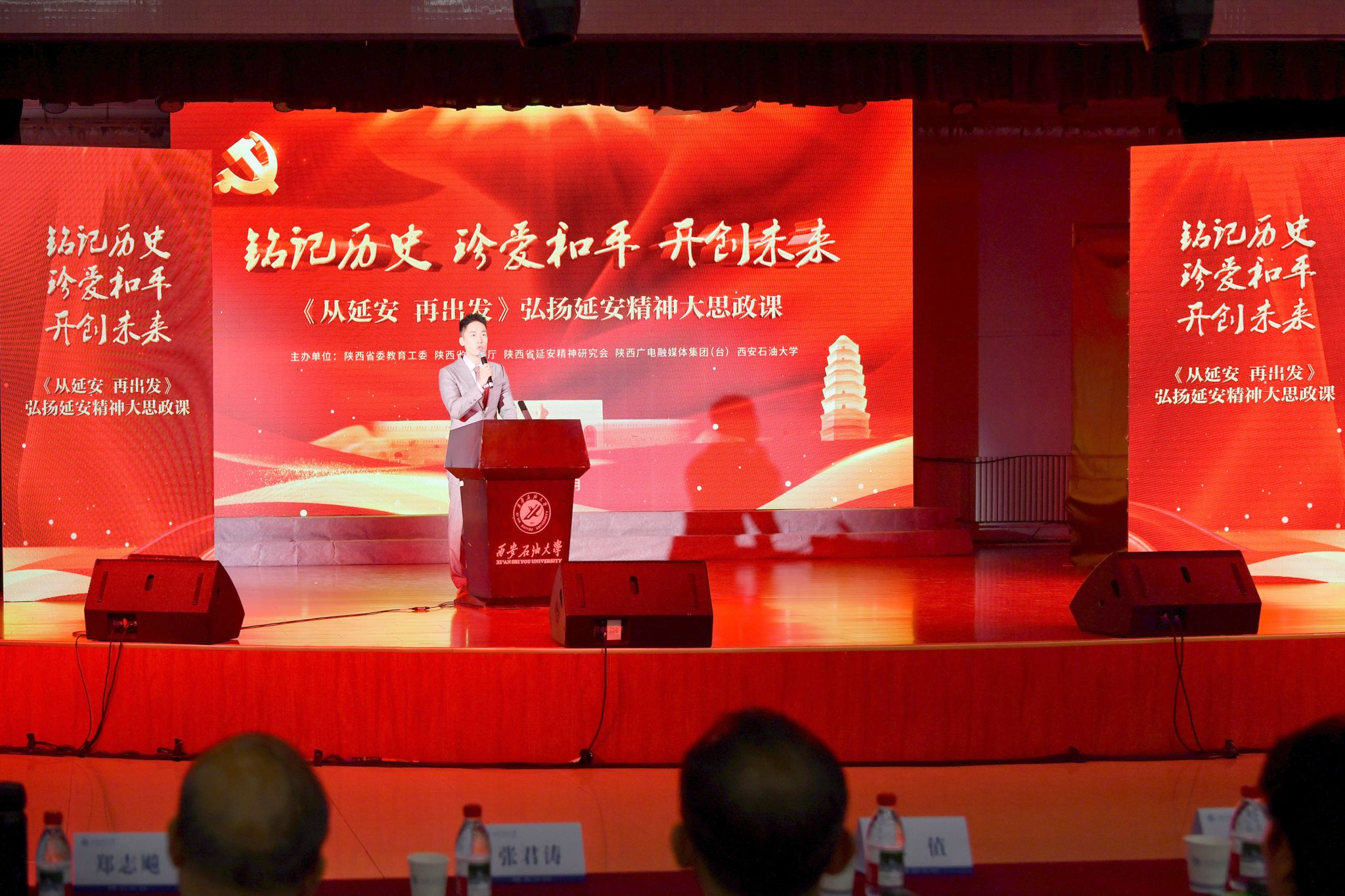 為深入貫徹落實習(xí)近平總書記關(guān)于弘揚延安精神的重要指示精神,推動延安精神進校園、進課堂、進頭腦,9月10日晚,由省委教育工委、省教育廳、省延安精神研究會、陜西廣電融媒體集團(臺)、西安石油大學(xué)聯(lián)合主辦的“從延安 再出發(fā)”弘揚延安精神開學(xué)第一堂“大思政課”首場在我校鄠邑校區(qū)騰輝活動中心舉行。陜西省延安精神研究會會長、陜西省人大常委會原副主任梁宏賢,陜西廣電融媒體集團(臺)黨委委員、副總編輯郭雄,西安市延安精神研究會會長李德文,鄠邑區(qū)委常委、區(qū)委宣傳部部長王值,我校校長王進富、校黨委副書記程永清、副校長張君濤以及師生代表出席宣講活動。“大思政課”還通過西安石油大學(xué)官微、抖音賬號等對外網(wǎng)絡(luò)直播,1.3萬余人次觀看了活動直播,點贊2.6萬余人次。