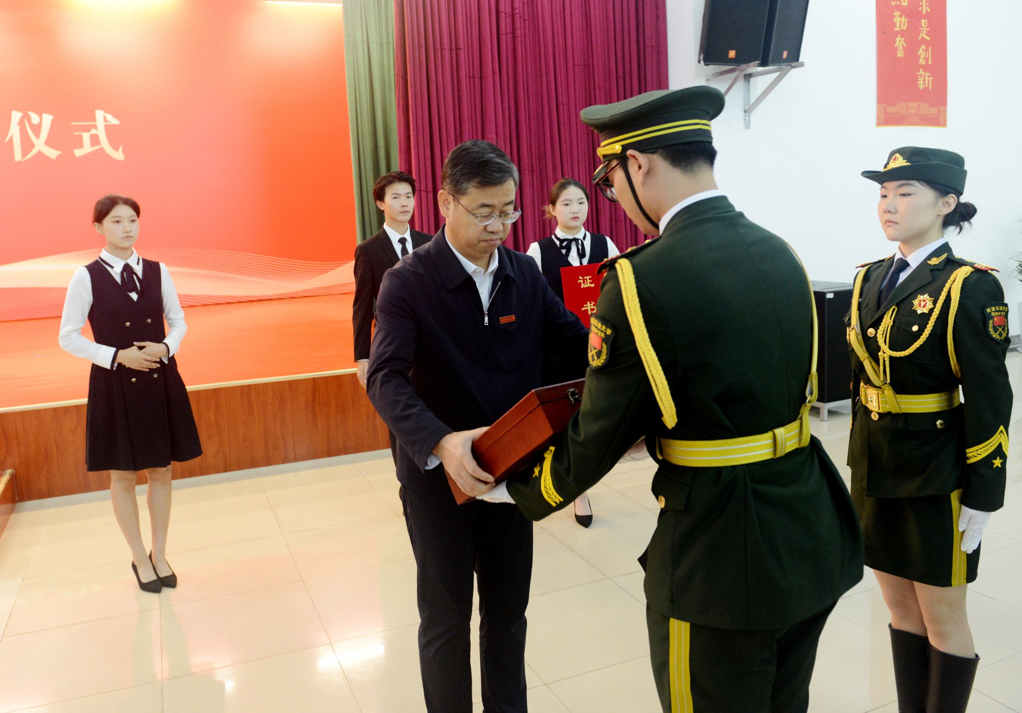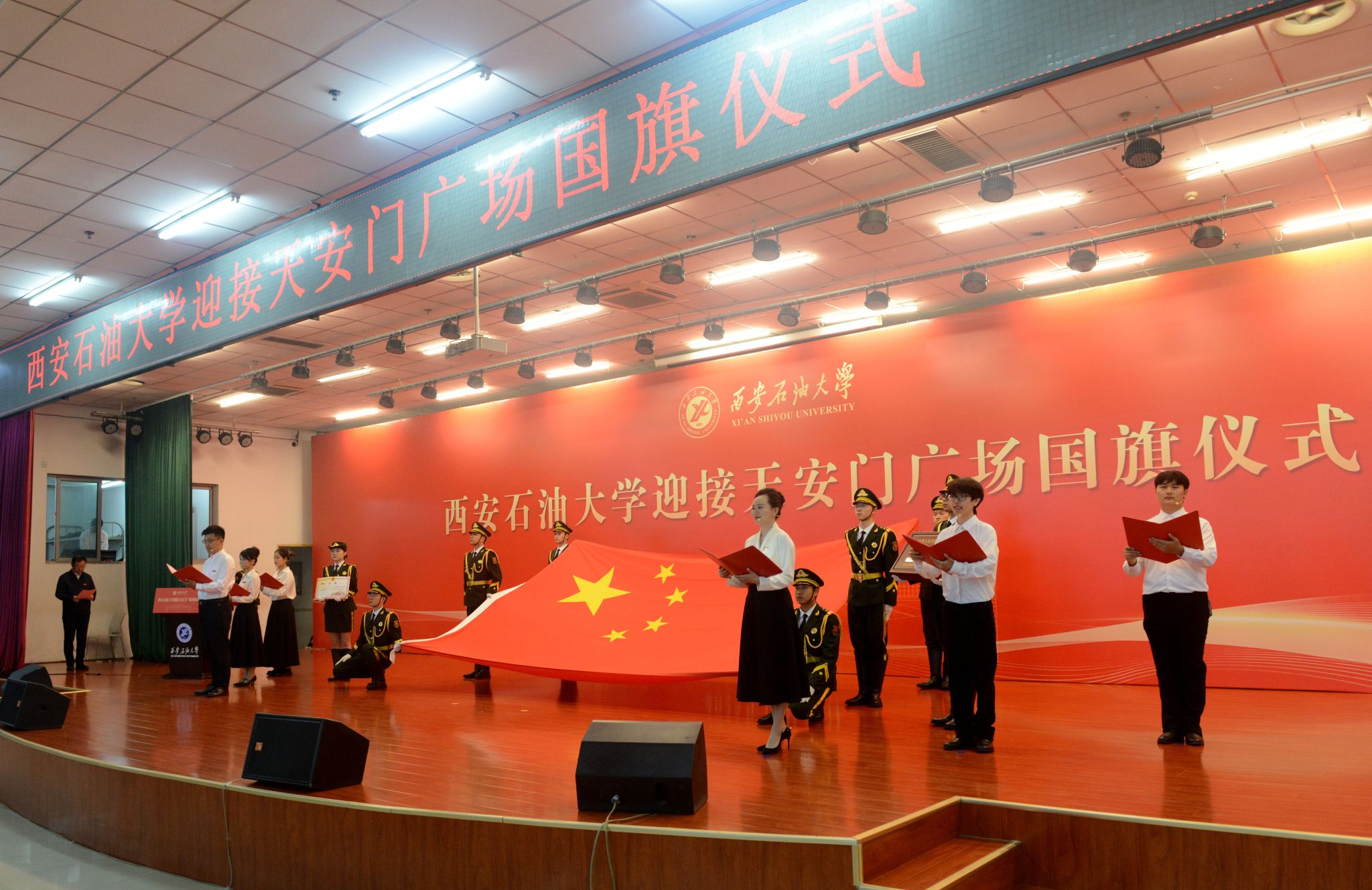 10月12日,時(shí)值西安石油大學(xué)74周年校慶日,我校在鄠邑校區(qū)騰輝大學(xué)生活動(dòng)中心舉行迎接天安門(mén)廣場(chǎng)國(guó)旗儀式。一面曾于2021年10月12日,暨我校建校70周年校慶日,在天安門(mén)廣場(chǎng)升掛過(guò)的國(guó)旗,經(jīng)天安門(mén)地區(qū)管委會(huì)批準(zhǔn)贈(zèng)予學(xué)校。全體校領(lǐng)導(dǎo)、處科級(jí)干部代表、民主黨派代表、校友代表及師生代表共計(jì)600余人參加儀式,儀式由副校長(zhǎng)種宇宏主持。
